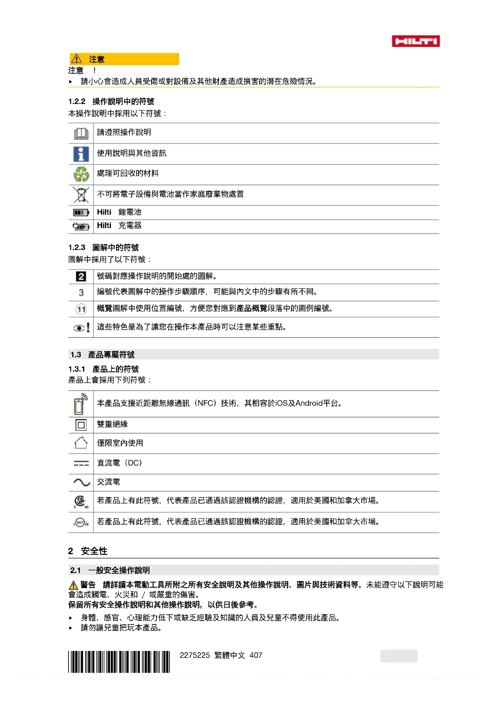 ▶ 電池應避免淋雨、潮濕和水氣。水氣滲入會造成短路、觸電、燙傷、起火和爆炸。 ▶ 請使用適用於該電池型號的充電器與電動工具。請詳閱並遵守相關操作說明書中的說明。 ▶ 請勿在易爆炸環境中使用或存放電池。 ▶ 若電池溫度過高無法觸摸,表示電池可能已經毀損。將電池放在清楚可見且沒有火災危險、遠離易燃材料 的位置。讓電池冷卻。若一小時後電池溫度仍然過高無法觸摸,表示電池可能已經毀損。請洽詢Hilti維修 中心或詳讀「Hilti鋰電池安全注意事項和使用」文件。 請遵守適用於運輸、存放和使用鋰離子電池的專用指令。 請透過本操作說明書末尾的條碼取得並詳讀Hilti鋰電池安全注意事項和使用。*2275225* 2275225 繁體中文 409 3 說明
