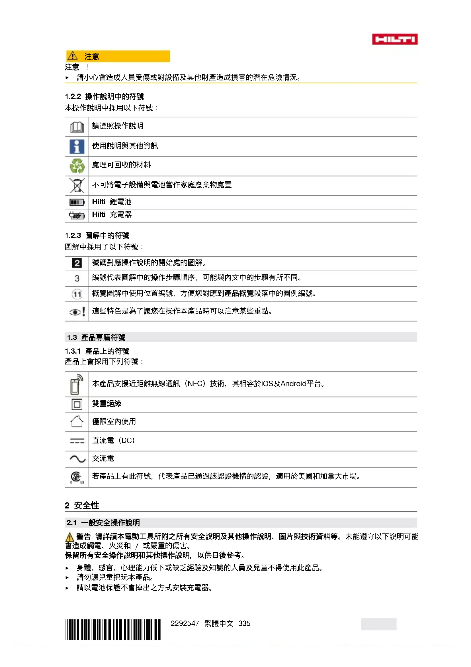 ▶ 此標語警示會造成嚴重傷害甚至致死危險的潛在威脅。*2292547* 2292547 繁體中文 335