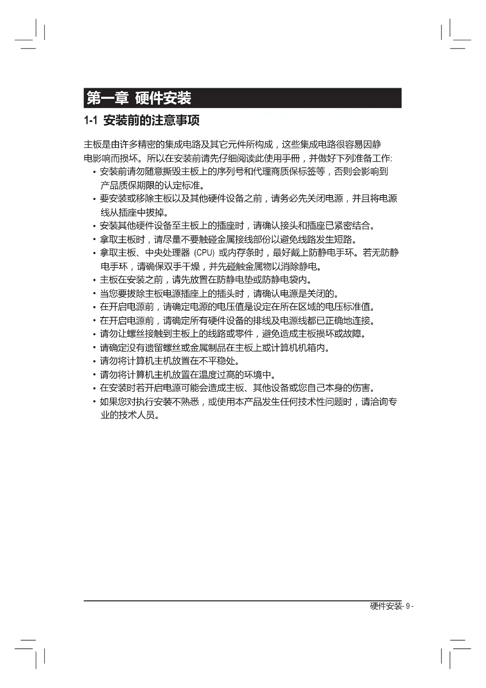 ICH10硬件安装- 9 - 1-1 安装前的注意事项 主板是由许多精密的集成电路及其它元件所构成,这些集成电路很容易因静 电影响而损坏。所以在安装前请先仔细阅读此使用手冊,并做好下列准备工作: