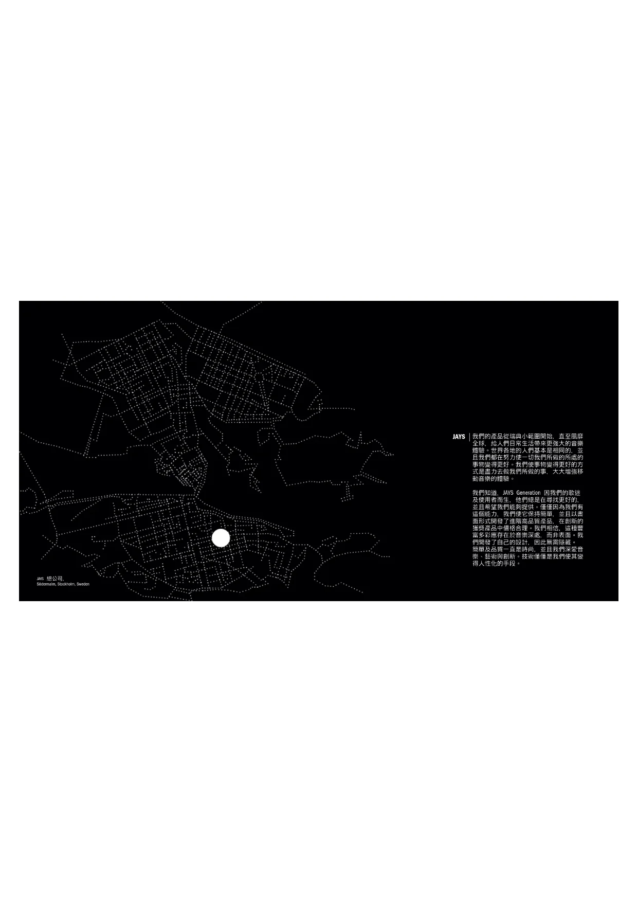 9796中文 9998JAYS 總公司, Södermalm, Stockholm, Sweden 我們的產品從瑞典小範圍開始,直至風靡 全球,給人們日常生活帶來更強大的音樂 體驗。世界各地的人們基本是相同的,並 且我們都在努力使一切我們所做的所處的 事物變得更好。我們使事物變得更好的方 式是盡力去做我們所做的事,大大增強移