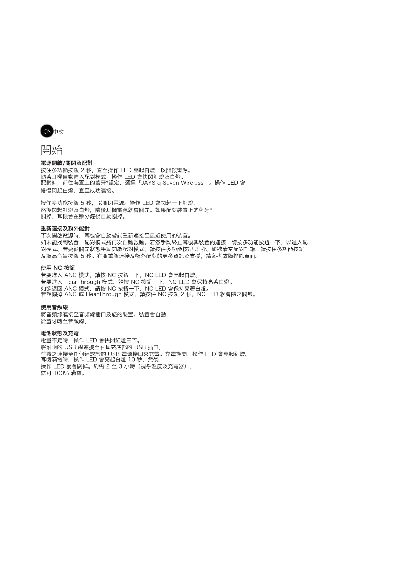 按住多功能按鈕 2 秒,直至操作 LED 亮起白燈,以開啟電源。 隨著耳機自動進入配對模式,操作 LED 會快閃紅燈及白燈。 配對時,前往裝置上的藍牙®設定,選擇「JAYS q-Seven Wireless」。操作 LED 會 慢慢閃起白燈,直至成功連接。 按住多功能按鈕 5 秒,以關閉電源。操作 LED 會閃起一下紅燈, 然後閃起紅燈及白燈,隨後耳機電源就會關閉。如果配對裝置上的藍牙® 關掉,耳機會在數分鐘後自動關掉。