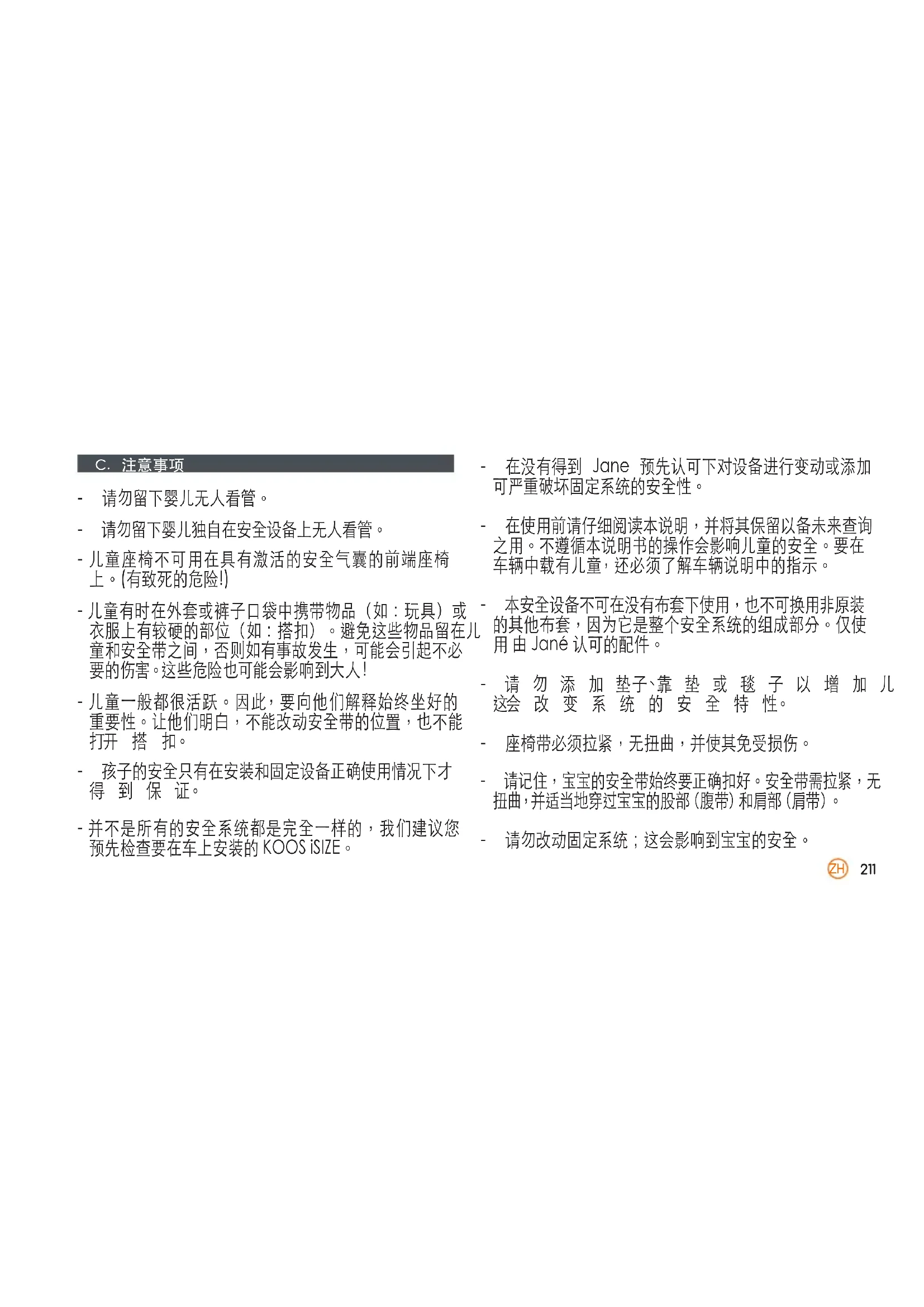 -并不是所有的安全系统都是完全一样的,我们建议您 预先检查要在车上安装的KOOSiSIZE。 - 在没有得到 Jane 预先认可下对设备进行变动或添加 可严重破坏固定系统的安全性。 - 在使用前请仔细阅读本说明,并将其保留以备未来查询 之用。不遵循本说明书的操作会影响儿童的安全。要在 车辆中载有儿童,还必须了解车辆说明中的指示。 - 本安全设备不可在没有布套下使用,也不可换用非原装 的其他布套,因为它是整个安全系统的组成部分。仅使 用由Jané认可的配件。 - 请 勿 添 加 垫 子、靠 垫 或 毯 子 以 增 加 儿 童 的 舒 适 度,因 为 这会 改 变 系 统 的 安 全 特 性。 - 座椅带必须拉紧,无扭曲,并使其免受损伤。 - 请记住,宝宝的安全带始终要正确扣好。安全带需拉紧,无 扭 曲, 并 适 当 地 穿 过 宝 宝 的 股 部( 腹 带 )和 肩 部( 肩 带 )。 - 请勿改动固定系统;这会影响到宝宝的安全。ZH