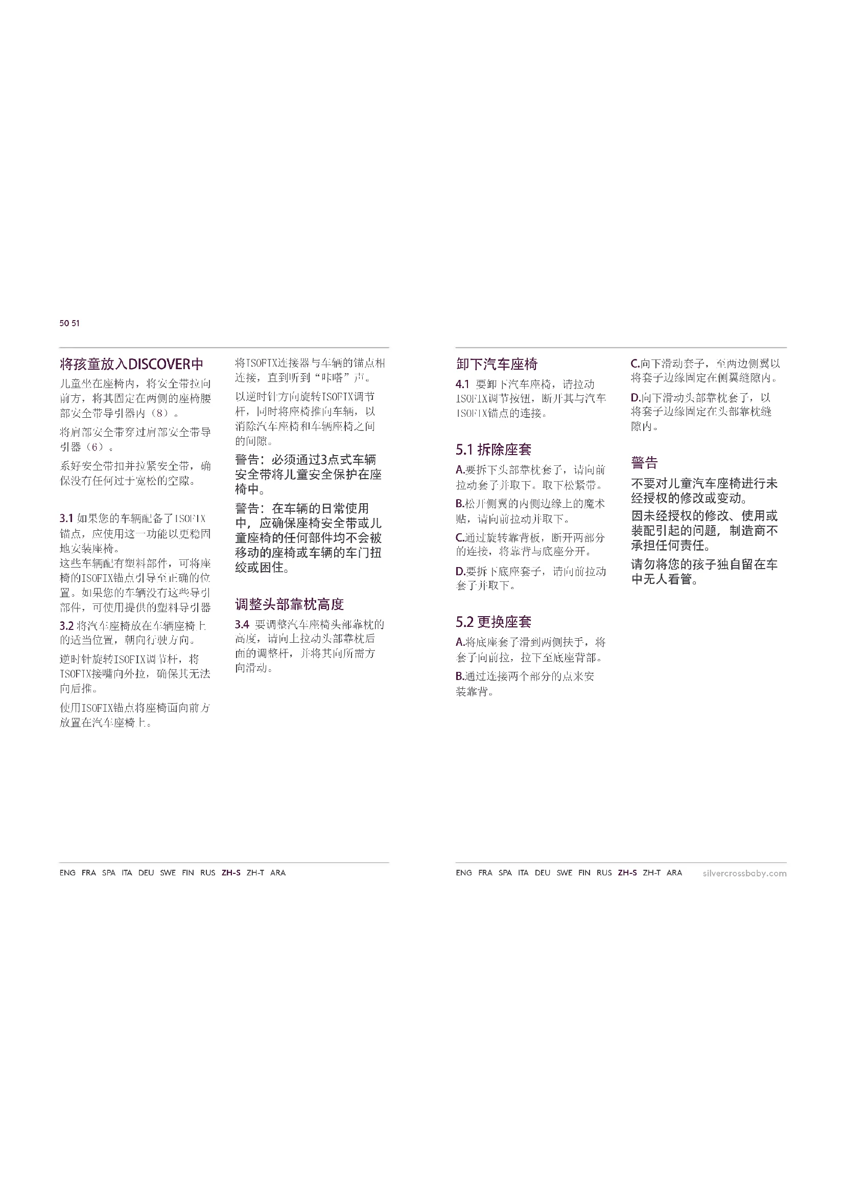 不可让孩童摆弄本产品。50 51 silvercrossbaby.com ENG FRA SPA ITA DEU SWE FIN RUS ZH-S ZH-T ARA ENG FRA SPA ITA DEU SWE FIN RUS ZH-S ZH-T ARA 将孩童放入DISCOVER中 儿童坐在座椅内,将安全带拉向 前方,将其固定在两侧的座椅腰 部安全带导引器内(8)。 将肩部安全带穿过肩部安全带导 引器(6)。 系好安全带扣并拉紧安全带,确 保没有任何过于宽松的空隙。