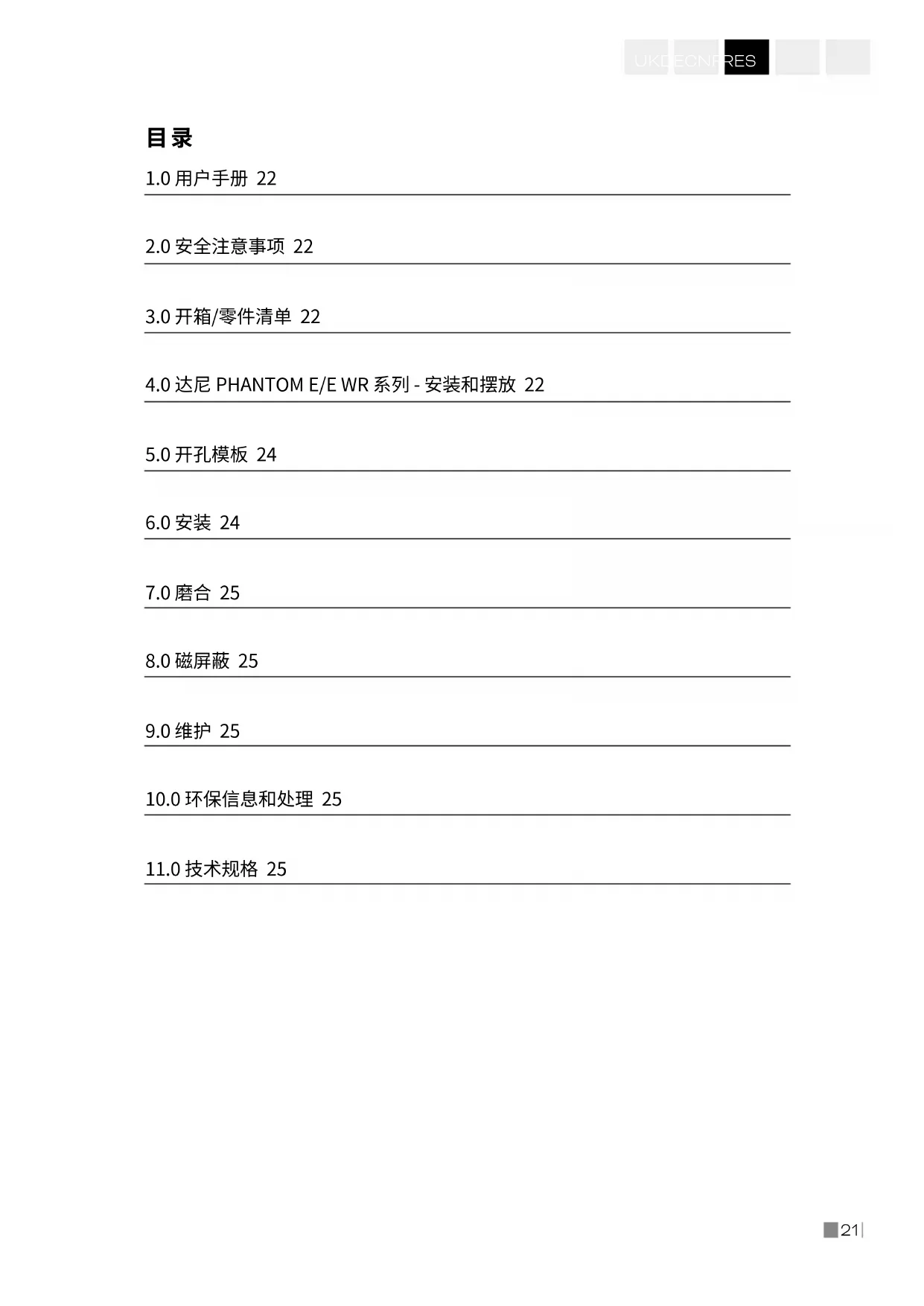 在音箱和聆听位置之间放置其他物品,可能会有损音质。PHANTOM E 系列的设计符合 我们的宽分散性声学理念。采用宽分散技术的音箱可以减少主听音区的失真,还能提23 UK DE CN FR ES 升音箱与室内环境的融合度。宽分散理念还能确保让声音均匀扩散到听音室内的大片