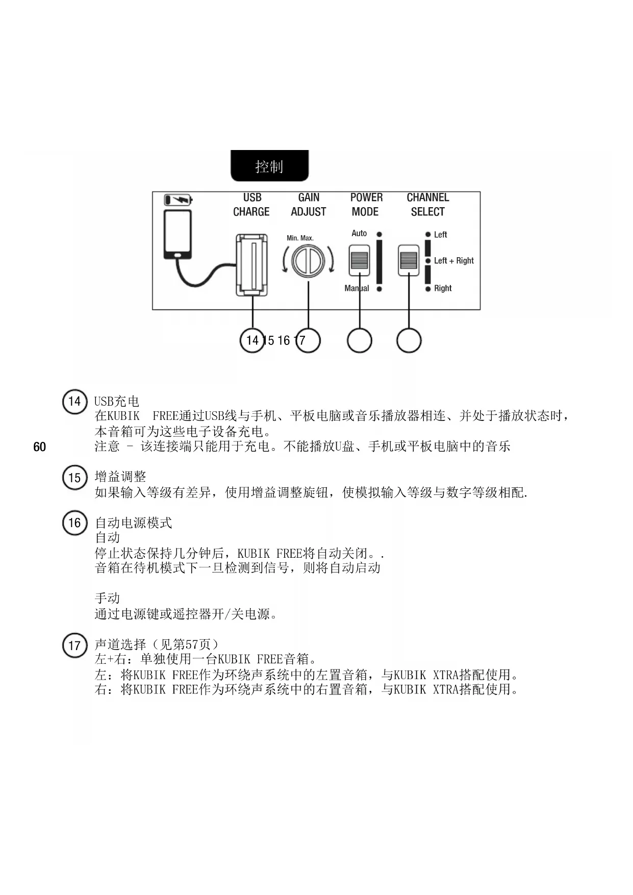 通过电源键或遥控器开/关电源。 声道选择(见第57页) 左+右:单独使用一台KUBIK FREE音箱。