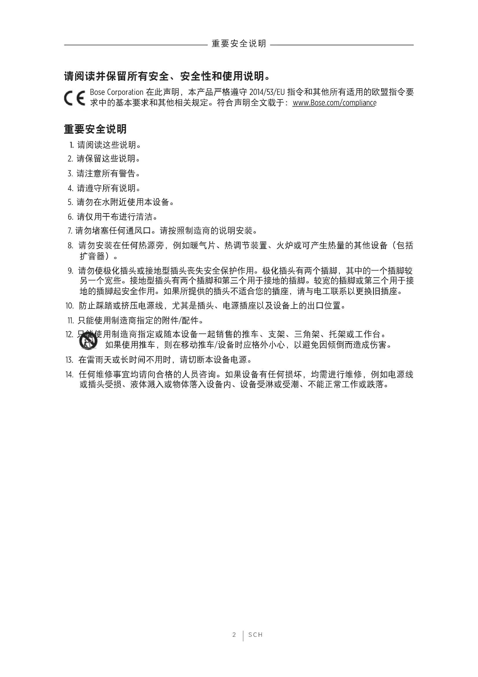 SCH 请阅读并保留所有安全、安全性和使用说明。 Bose Corporation 在此声明,本产品严格遵守 2014/53/EU 指令和其他所有适用的欧盟指令要 求中的基本要求和其他相关规定。符合声明全文载于:www.Bose.com/compliance