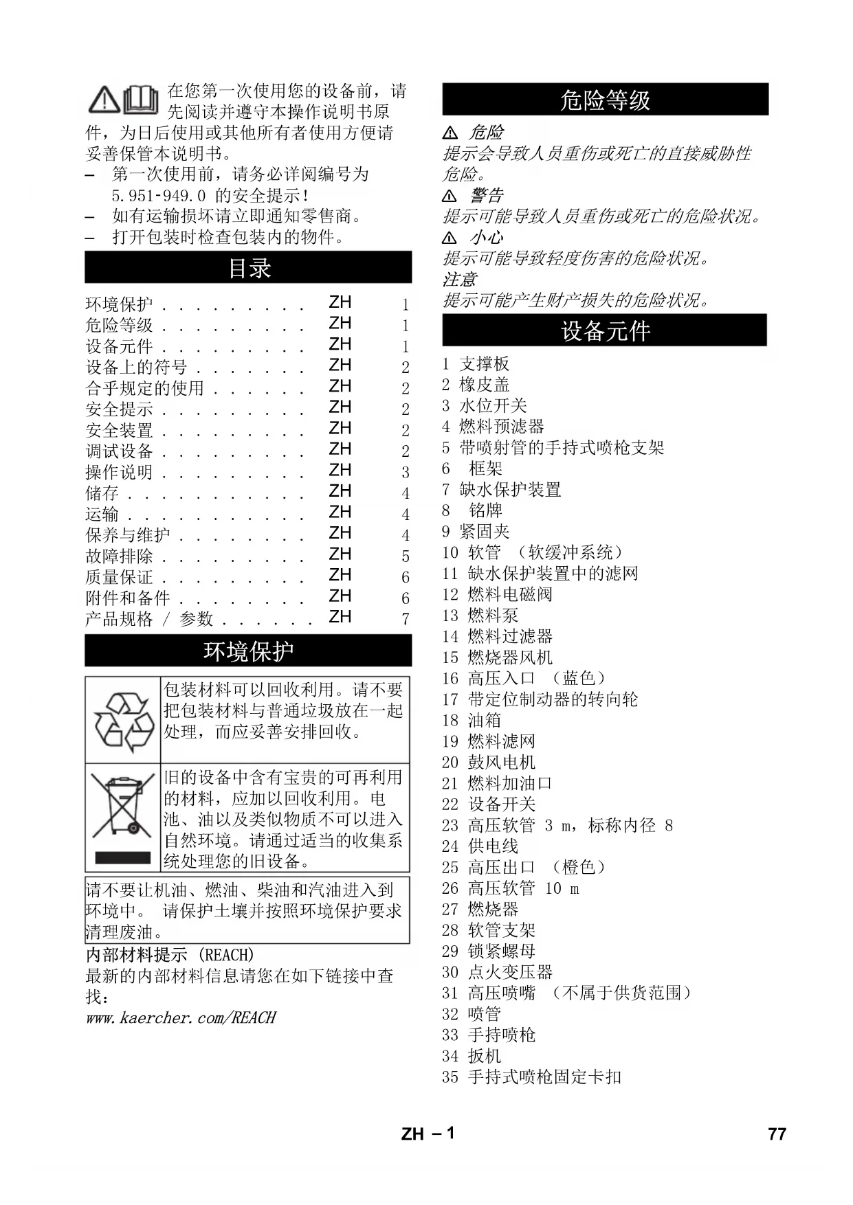 77ZH– 2 不正确地使用高压喷射是很危险 的。不能对准人、动物、电器设