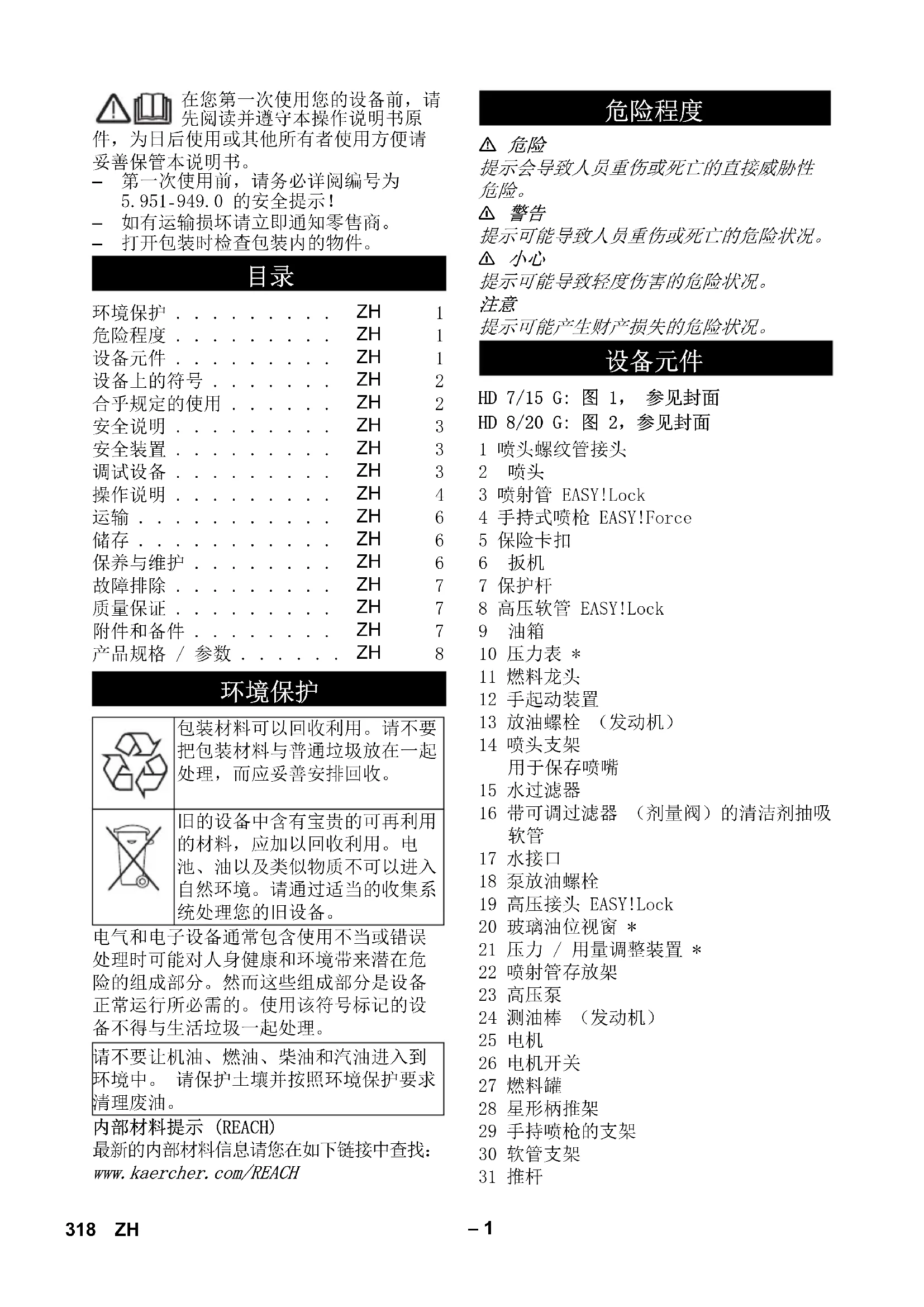 – 如有运输损坏请立即通知零售商。 – 打开包装时检查包装内的物件。 电气和电子设备通常包含使用不当或错误 处理时可能对人身健康和环境带来潜在危 险的组成部分。然而这些组成部分是设备 正常运行所必需的。使用该符号标记的设 备不得与生活垃圾一起处理。 内部材料提示 (REACH) 最新的内部材料信息请您在如下链接中查找: www.kaercher.com/REACH