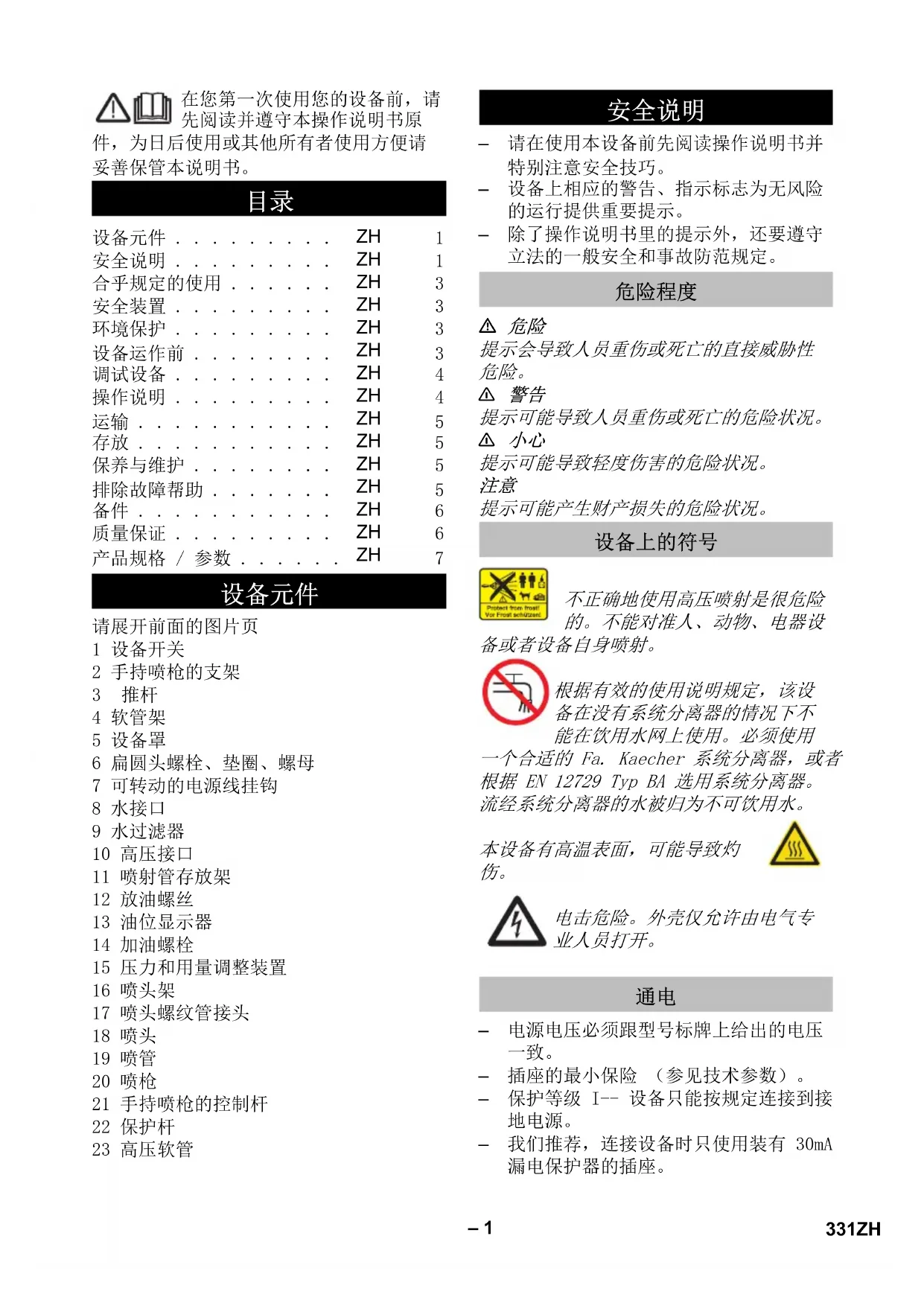 1 設備開關 2 手持噴槍把手 3推杆 4 軟管托架 5 裝置罩 6 扁圓頭螺栓、墊圈、螺母 7 電纜掛鉤,可旋轉的 8 水接頭 9 水過濾器 10 高壓接頭 11 噴射管托架 12 放油塞 13 油位指示器 14 加油塞 15 壓力和流量調整 16 噴嘴托架 17 噴嘴螺紋接頭 18 噴嘴 19 噴射管 20 手持噴槍 21 手持噴槍控制杆 22 安全控制杆 23 高壓軟管 – 開啟裝置前,請先閱讀裝置作業說明並 特別注意安全提示之相關訊息。 – 安放於裝置上之警示和提示標識給出了 用於確保安全運行之重要提示。 – 除本作業說明書中之提示外,還必須遵 守立法機關之一般安全和事故預防規