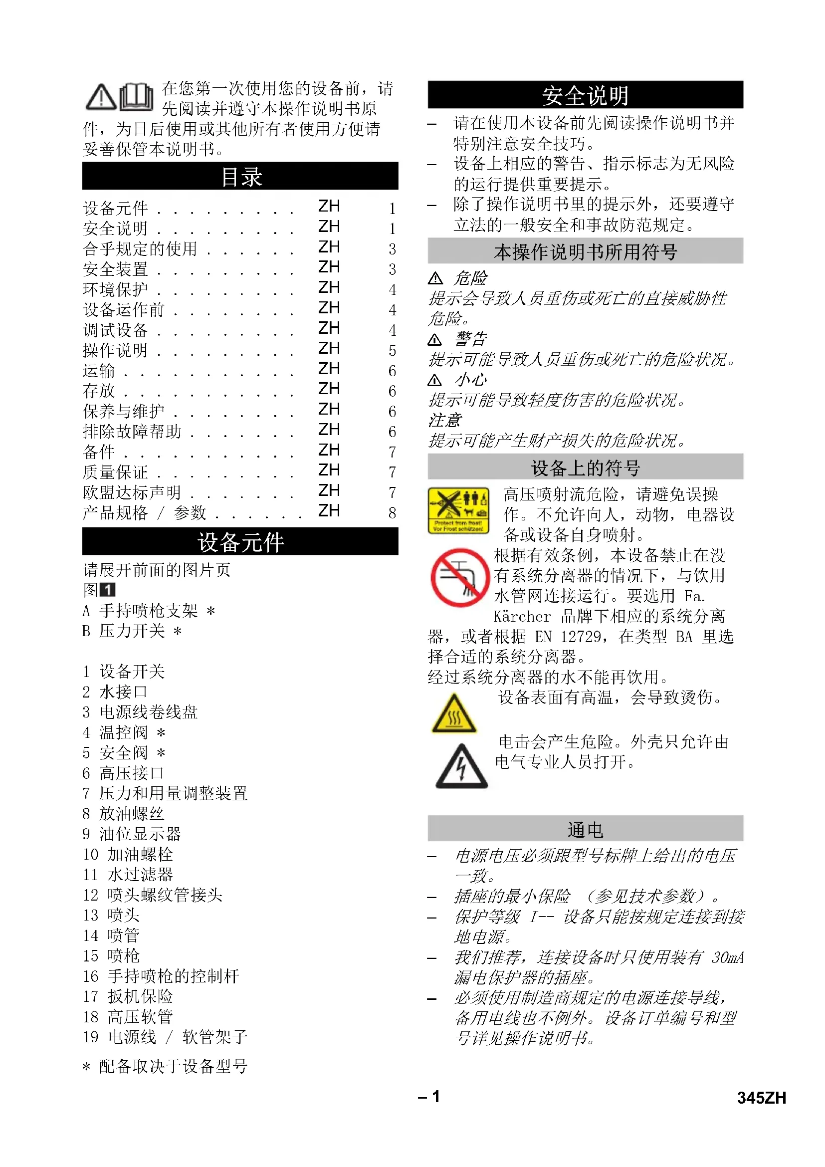 提示可能產生財產損失的危險狀況。 若使用不當,高壓水束可帶來危 險。 水束不得對準人、動物、正 在使用之電器裝備或者設備本身。 依照有效之使用說明規定,該裝 置在沒有系統分離器之情形下不 能在飲用水網路使用。 必須使用 一個合適的 Kärcher 公司之系統 分離器,或者依照 EN 12729 Typ BA 選用