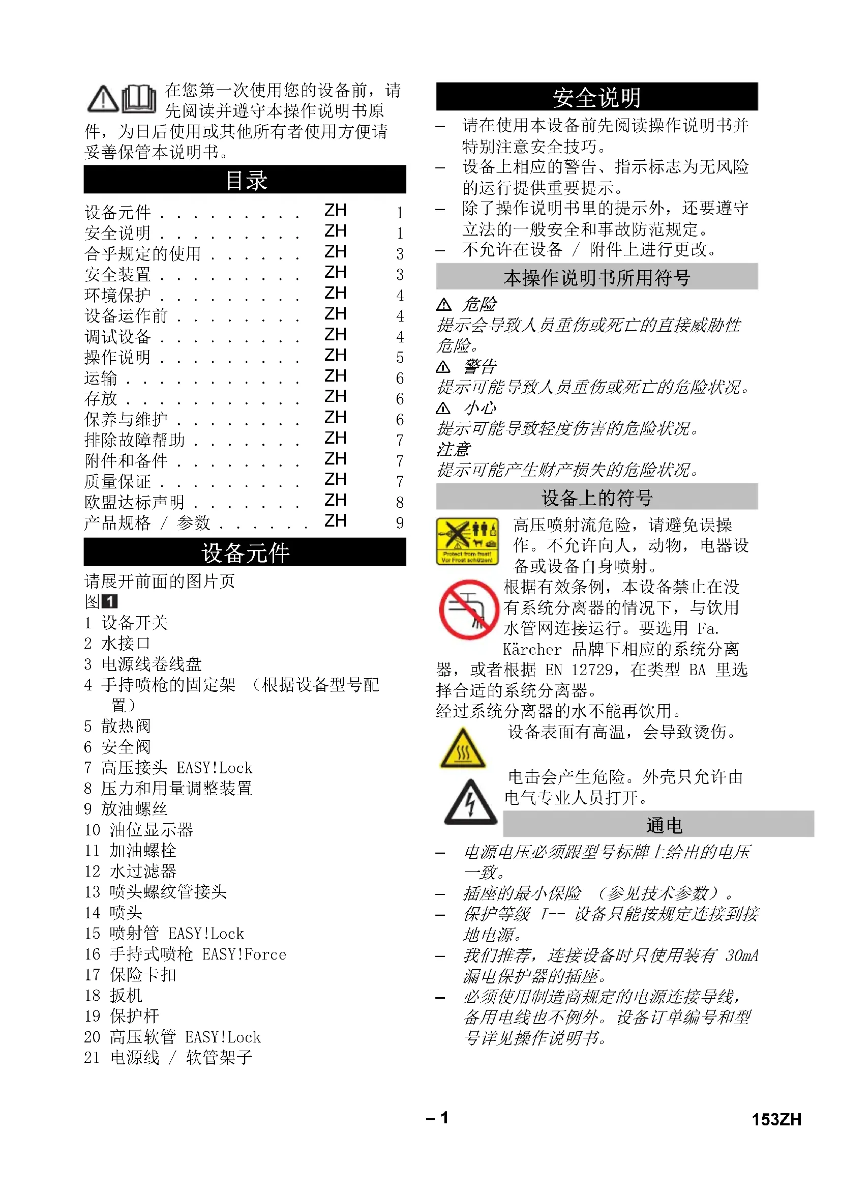 5 熱力閥 6 安全閥 7 高壓接頭 EASY!Lock 8 壓力和流量調整 9 放油塞 10 油位指示器 11 加油塞 12 水過濾器 13 噴嘴螺紋接頭 14 噴嘴 15 噴射管 EASY!Lock 16 手持式噴槍 EASY!Force 17 保險卡扣 18 扳機 19 安全控制杆 20 高壓軟管 EASY!Lock 21 電纜 / 軟管擱架 – 開啟裝置前,請先閱讀裝置作業說明並 特別注意安全提示之相關訊息。 – 安放於裝置上之警示和提示標識給出了 用於確保安全運行之重要提示。 – 除本作業說明書中之提示外,還必須遵 守立法機關之一般安全和事故預防規