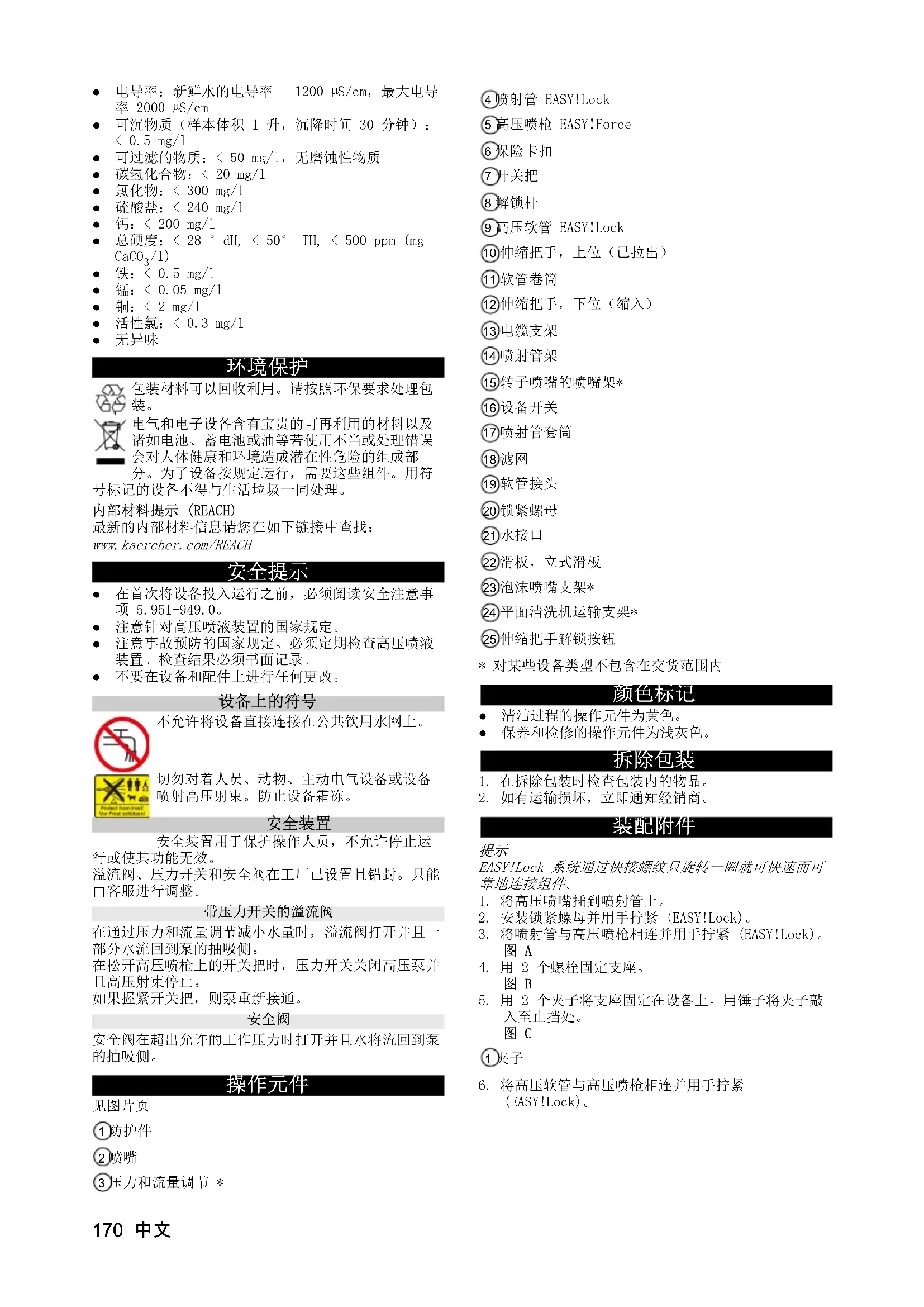 ● 在首次将设备投入运行之前,必须阅读安全注意事 项 5.951-949.0。 ● 注意针对高压喷液装置的国家规定。 ● 注意事故预防的国家规定。必须定期检查高压喷液 装置。检查结果必须书面记录。 ● 不要在设备和配件上进行任何更改。