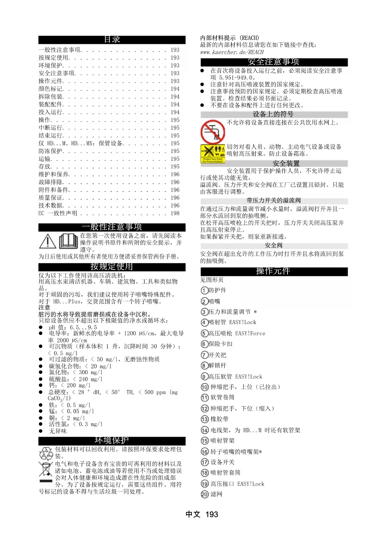 电气和电子设备含有宝贵的可再利用的材料以及 诸如电池、蓄电池或油等若使用不当或处理错误 会对人体健康和环境造成潜在性危险的组成部 分。为了设备按规定运行,需要这些组件。用符 号标记的设备不得与生活垃圾一同处理。 内部材料提示 (REACH) 最新的内部材料信息请您在如下链接中查找: www.kaercher.de/REACH