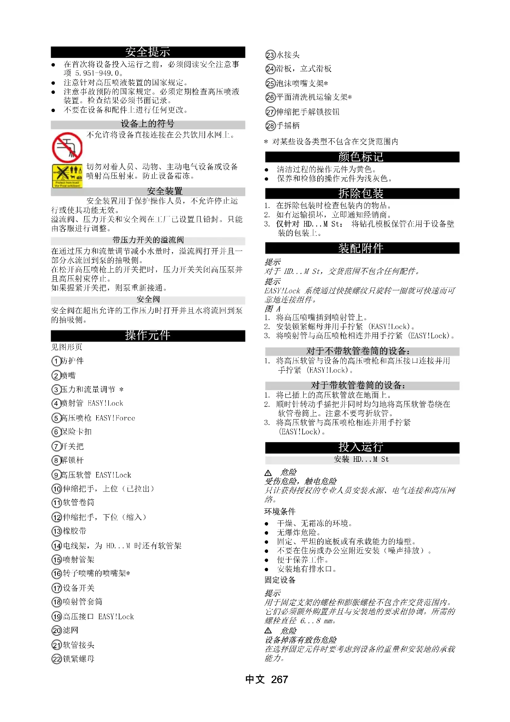 1 防护件2 喷嘴3 压力和流量调节 *4 喷射管 EASY!Lock5 高压喷枪 EASY!Force6 保险卡扣7 开关把8 解锁杆9 高压软管 EASY!Lock10 伸缩把手,上位(已拉出)11 软管卷筒12 伸缩把手,下位(缩入)13 橡胶带14 电线架,为 HD...M 时还有软管架15 喷射管架16 转子喷嘴的喷嘴架*17 设备开关18 喷射管套筒19 高压接口 EASY!Lock20 滤网21 软管接头22 锁紧螺母23 水接头24 滑板,立式滑板25 泡沫喷嘴支架*26 平面清洗机运输支架*27 伸缩把手解锁按钮28 手摇柄