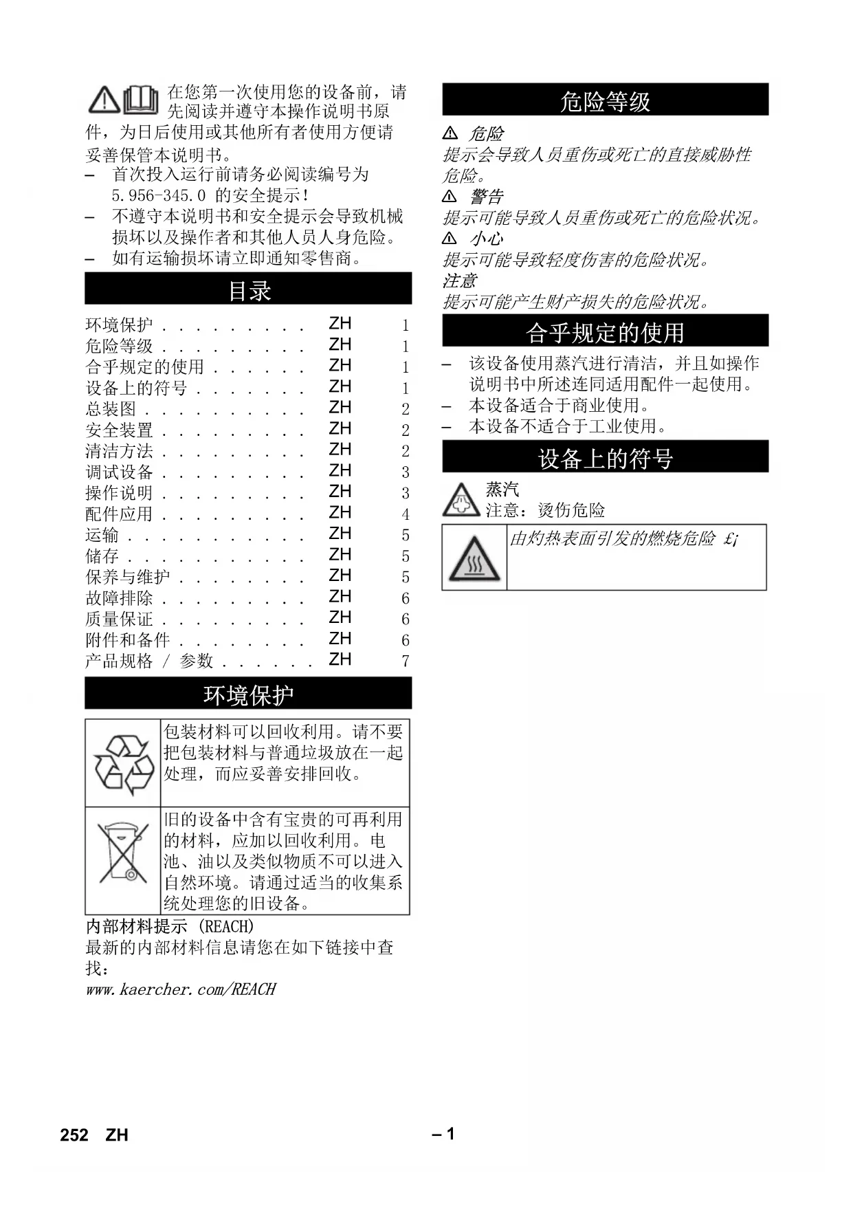 提示可能产生财产损失的危险状况。 – 该设备使用蒸汽进行清洁,并且如操作 说明书中所述连同适用配件一起使用。 – 本设备适合于商业使用。 – 本设备不适合于工业使用。