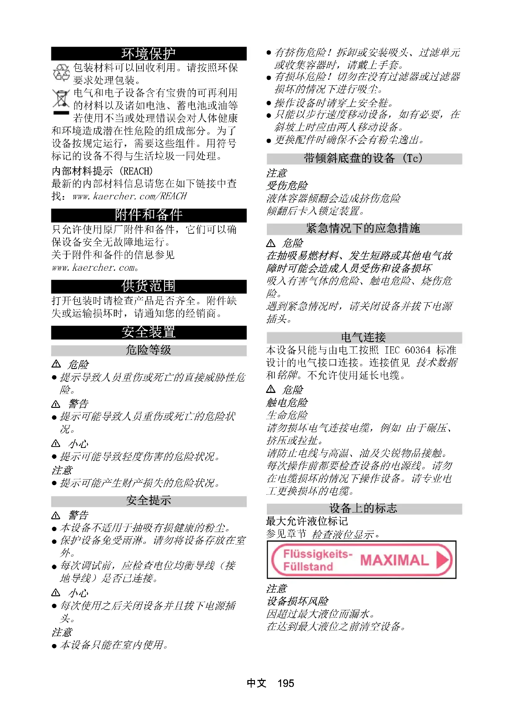 电气和电子设备含有宝贵的可再利用 的材料以及诸如电池、蓄电池或油等 若使用不当或处理错误会对人体健康 和环境造成潜在性危险的组成部分。为了 设备按规定运行,需要这些组件。用符号 标记的设备不得与生活垃圾一同处理。 内部材料提示 (REACH) 最新的内部材料信息请您在如下链接中查