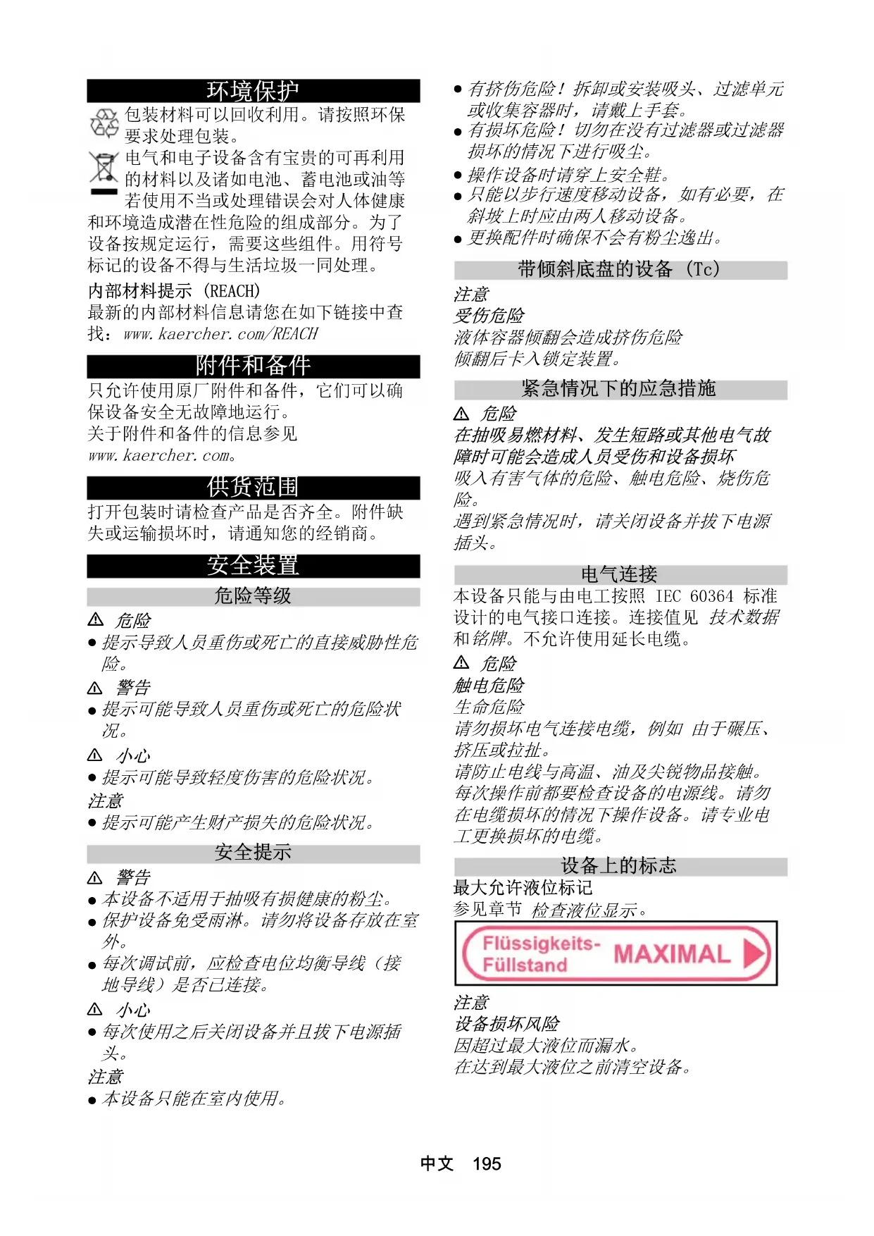 电气和电子设备含有宝贵的可再利用 的材料以及诸如电池、蓄电池或油等 若使用不当或处理错误会对人体健康 和环境造成潜在性危险的组成部分。为了 设备按规定运行,需要这些组件。用符号 标记的设备不得与生活垃圾一同处理。 内部材料提示 (REACH) 最新的内部材料信息请您在如下链接中查