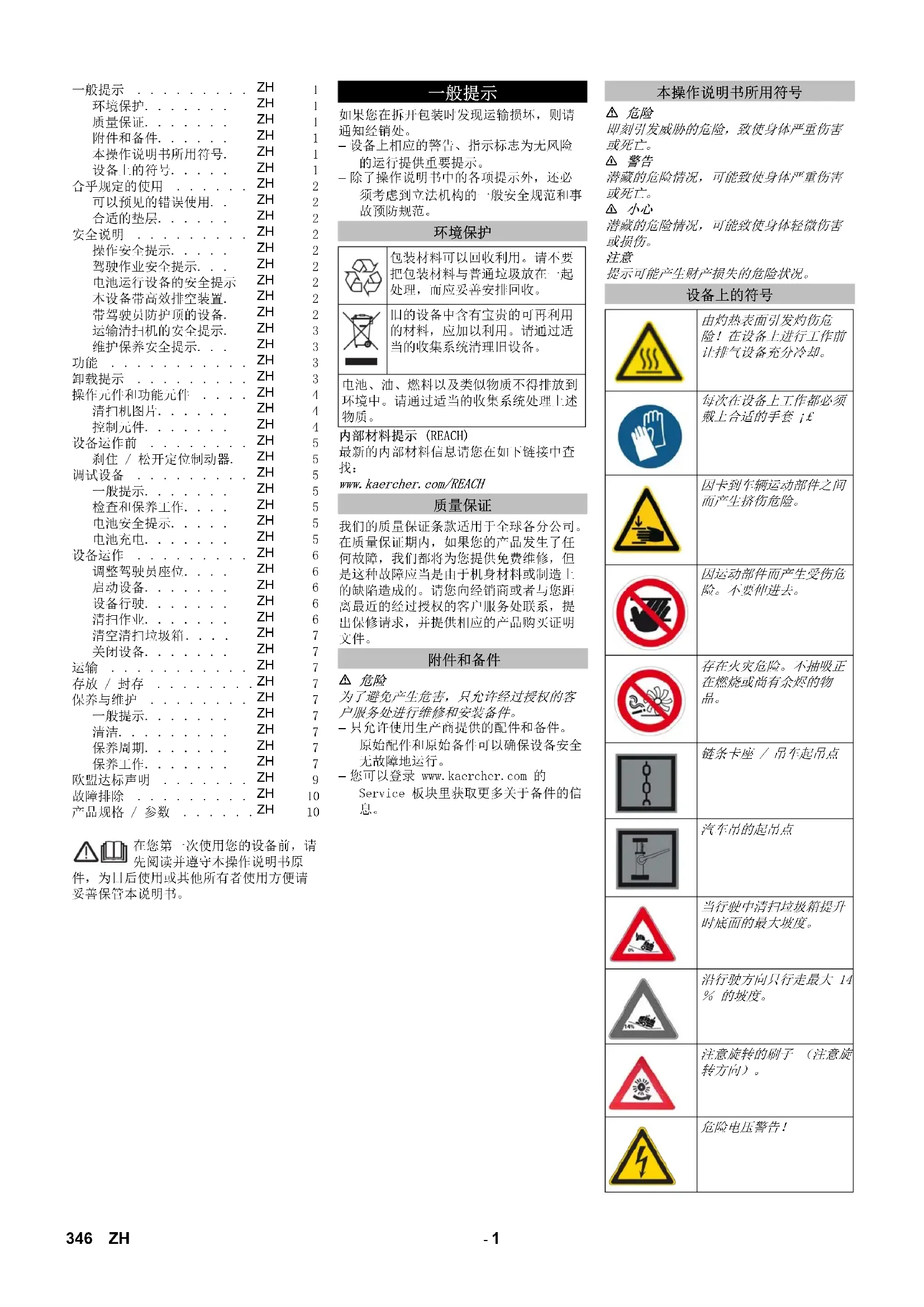 346 ZH- 2清尘车用于清洁企业使用地面,如下列使 停车处 生产车间 物流区域 旅馆 零售业 仓储区域 人行道– 本清扫机专用于清扫室内及室外区域内的受污面。– 在使用设备及其装配前应先检查它们的规定状态和操作安全性。如果设备的状态存有疑问,则不允许使用设备。– 请只根据本操作说明书中的说明使用本 – 不得在设备上进行改造。– 该设备仅适用于操作说明书中已鉴定的 – 只允许在企业或其委托人为机器使用所批准的面上行驶。– 总体上适用下列各项要点:将易燃性材料远离本设备 (存在爆炸危险 / 火灾危 从不要清扫 / 抽吸爆炸性液体、可燃性气体以及未经稀释的酸和溶剂。为此有汽油、油漆稀释剂或燃油,它们因与抽吸空气产生涡流而可行程爆炸性蒸汽或混合气体。此外还有丙酮未经稀释的酸和溶剂,因为它们会侵蚀设备上所使用的材料。。 从不要清扫 / 抽吸反应性金属灰尘 (如铝、镁、锌),这些金属灰尘与强碱性或酸性清洗剂化合,形成爆炸性气体。 不要清扫 / 抽吸正在燃烧或余烬未灭的 本设备不适用于清扫对健康有害的物 禁止逗留在危险区域内。禁止在有爆炸危险的空间内运行本设备。 该设备不允许携带护送人员。 不允许推 / 拉本设备,或使用本设备运 – 沥青– 工业地面– 无缝地面– 混凝土– 地砖