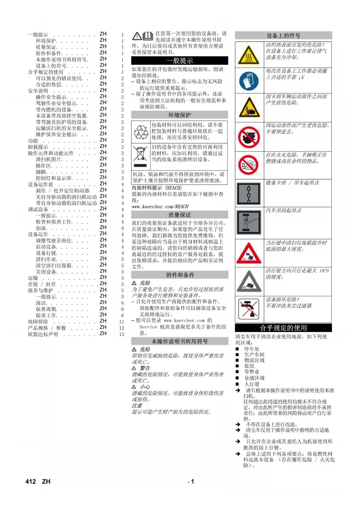 412 ZH- 2 从不要清扫 / 抽吸爆炸性液体、可燃性气体以及未经稀释的酸和溶剂。为此有汽油、油漆稀释剂或燃油,它们因与抽吸空气产生涡流而可行程爆炸性蒸汽或混合气体。此外还有丙酮未经稀释的酸和溶剂,因为它们会侵蚀设备上所使用的材料。。 从不要清扫 / 抽吸反应性金属灰尘 (如铝、镁、锌),这些金属灰尘与强碱性或酸性清洗剂化合,形成爆炸性气体。 不要清扫 / 抽吸正在燃烧或余烬未灭的 本设备不适用于清扫对健康有害的物 不得在封闭的空间内使用本设备。 禁止逗留在危险区域内。禁止在有爆炸危险的空间内运行本设备。 该设备不允许携带护送人员。 不允许推 / 拉本设备,或使用本设备运 沥青 工业地面 无缝地面 混凝土 地砖