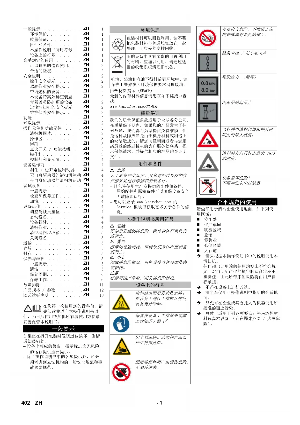 402 ZH- 2 从不要清扫 / 抽吸爆炸性液体、可燃性气体以及未经稀释的酸和溶剂。为此有汽油、油漆稀释剂或燃油,它们因与抽吸空气产生涡流而可行程爆炸性蒸汽或混合气体。此外还有丙酮未经稀释的酸和溶剂,因为它们会侵蚀设备上所使用的材料。。 从不要清扫 / 抽吸反应性金属灰尘 (如铝、镁、锌),这些金属灰尘与强碱性或酸性清洗剂化合,形成爆炸性气体。 不要清扫 / 抽吸正在燃烧或余烬未灭的 本设备不适用于清扫对健康有害的物 不得在封闭的空间内使用本设备。 禁止逗留在危险区域内。禁止在有爆炸危险的空间内运行本设备。 该设备不允许携带护送人员。 不允许推 / 拉本设备,或使用本设备运 沥青 工业地面 无缝地面 混凝土 地砖