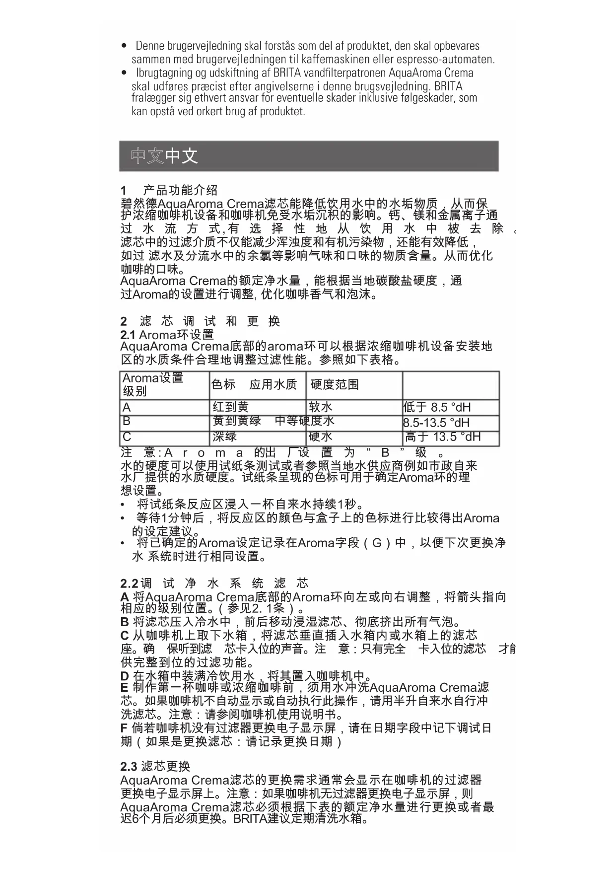 - 碧然德AquaAromaCrema滤芯必须按照本使用说明书进行调试和 更换。碧然德不会对因不正确使用产品而造成的任何损害,包括后续