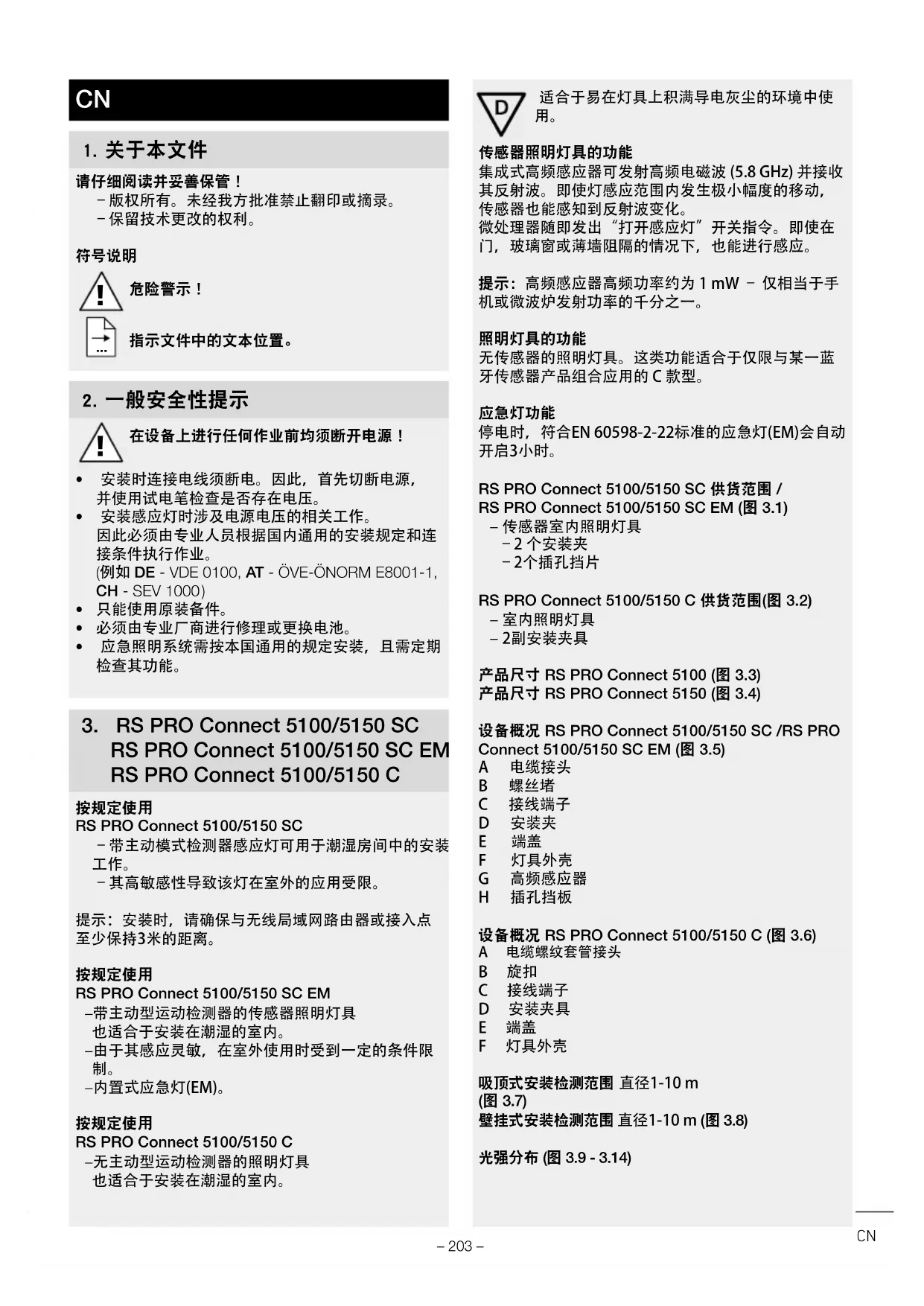 – 2副安装夹具 产品尺寸 RS PRO Connect 5100 (图 3.3) 产品尺寸 RS PRO Connect 5150 (图 3.4) 设备概况 RS PRO Connect 5100/5150 SC /RS PRO Connect 5100/5150 SC EM (图 3.5) A电缆接头 B螺丝堵 C接线端子 D安装夹 E端盖 F灯具外壳 G高频感应器 H插孔挡板 设备概况 RS PRO Connect 5100/5150 C (图 3.6) A 电缆螺纹套管接头 B 旋扣 C 接线端子 D 安装夹具 E 端盖 F 灯具外壳 吸顶式安装检测范围直径1-10m (图 3.7) 壁挂式安装检测范围直径1-10m (图 3.8) 光强分布 (图 3.9 - 3.14) CN– 204 – 4.电气连接 电路图(图4.1) 电源线由3芯电缆组成: L =火线(通常是黑色,棕色或灰色) N =零线(大多为蓝色) E =保护线(绿色/黄色) 不确定时,必须使用试电笔鉴定电缆,然后重新切断 电源。相位(L),中性导体(N)和保护导线(E)连接在插