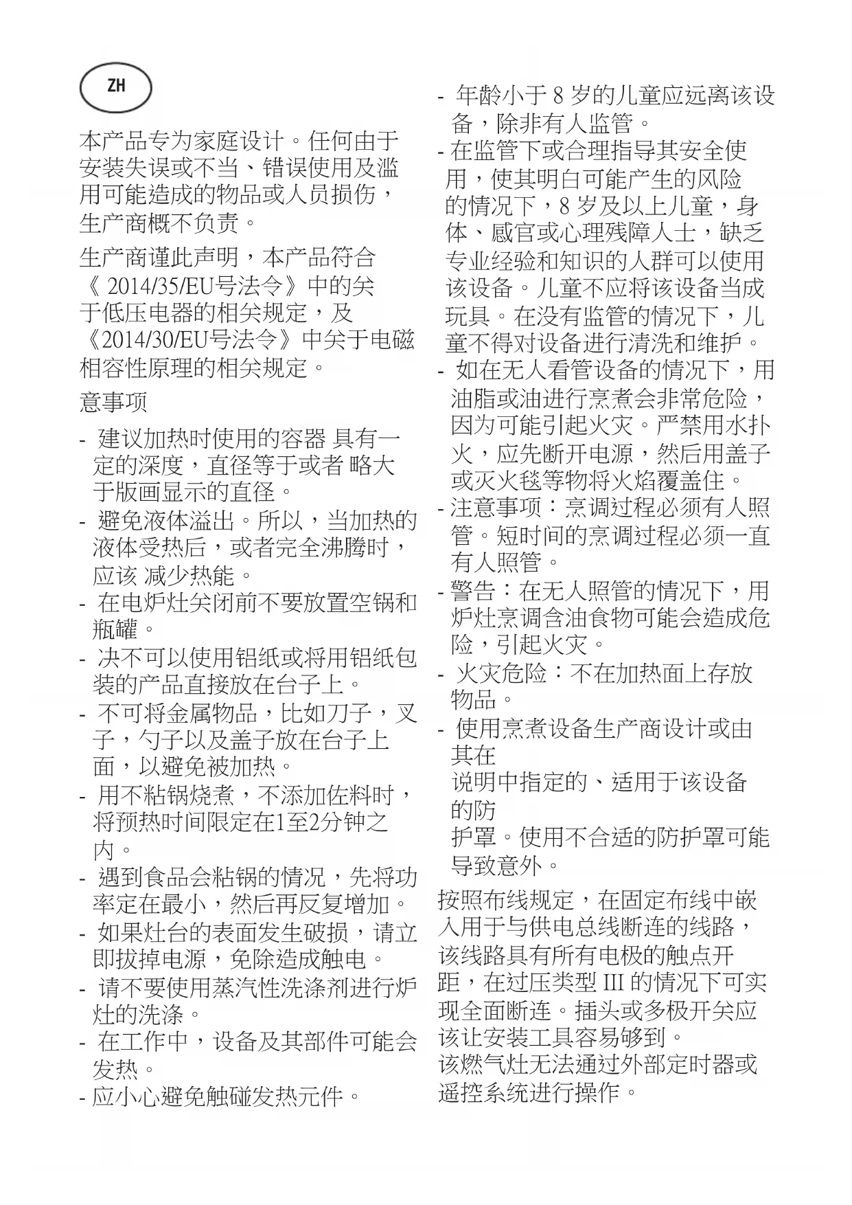 - 在监管下或合理指导其安全使 用,使其明白可能产生的风险 的情况下,8 岁及以上儿童,身 体、感官或心理残障人士,缺乏 专业经验和知识的人群可以使用 该设备。儿童不应将该设备当成 玩具。在没有监管的情况下,儿 童不得对设备进行清洗和维护。 - 如在无人看管设备的情况下,用 油脂或油进行烹煮会非常危险, 因为可能引起火灾。严禁用水扑 火,应先断开电源,然后用盖子 或灭火毯等物将火焰覆盖住。 - 注意事项:烹调过程必须有人照 管。短时间的烹调过程必须一直