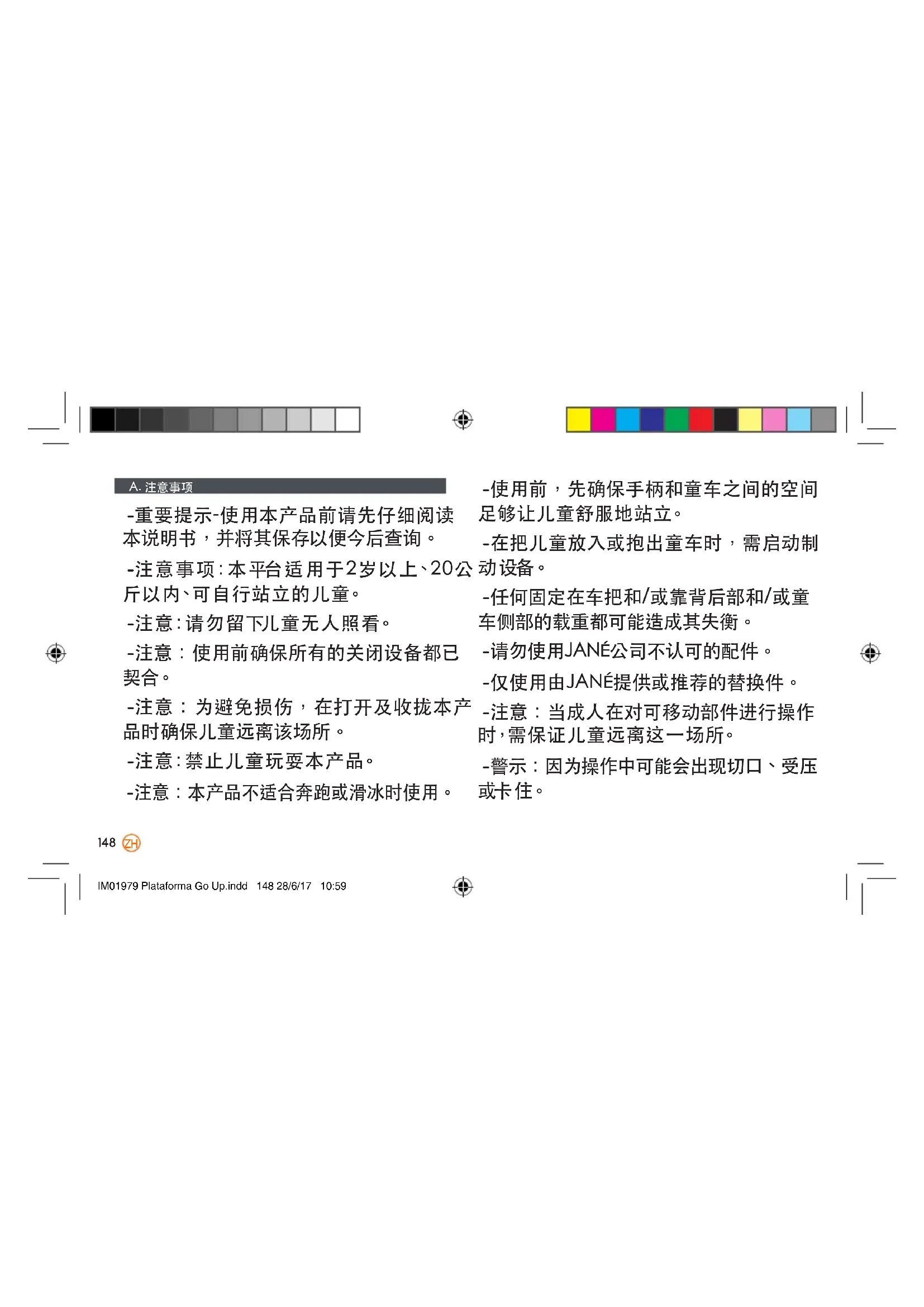 J.保修信息 根据11月16日第1/2007号皇家法令,本商品包括质量保证。请保留购货发票。如 需申诉,需在购买商店处出示发票以证明其保修期。 本保修不包括那些因为产品使用不当、违反安全标准和维护说明书及洗涤说明标 签以及正常磨损和日常使用造成的缺陷或故障。 切勿撕下包括车型号等重要信息的标签。 要获得有关这一 JANÉ 新产品的最大安全性及服务,请务必填写 www.jane.es 网页 上获得 的注册 卡。 通过该注册卡可以在必要情况下获得本产品更新和维护方面的信息。如有需要, 我们也会通知您可能感兴趣的新款产品和新闻。 IM01979 Plataforma Go Up.indd 152 28/6/17 10:59153