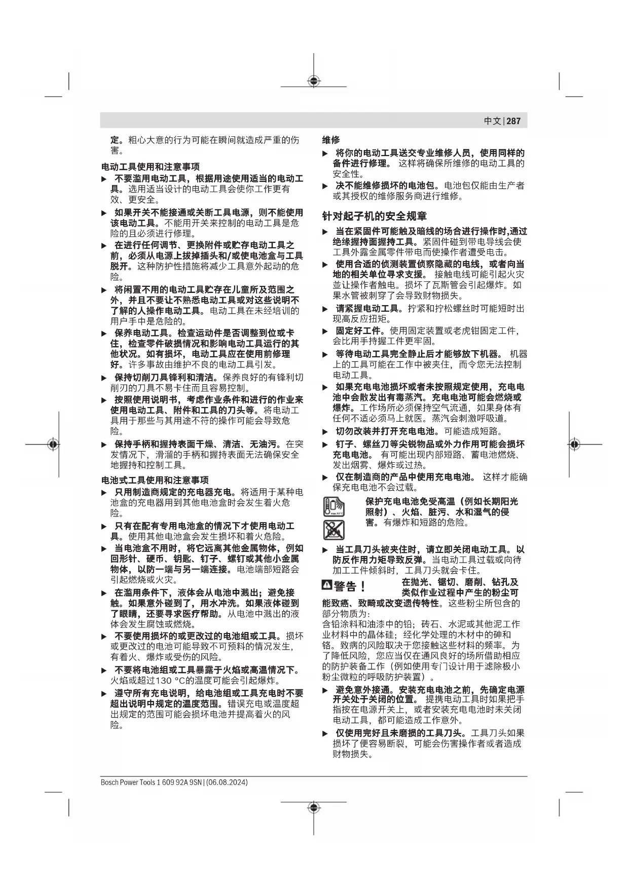 u 即使由于经常使用电动工具而对此非常熟悉,也 不要就认为可以高枕无忧而忽略工具的安全规 1 609 92A 9SN | (06.08.2024) Bosch Power Tools中文 | 287 定。粗心大意的行为可能在瞬间就造成严重的伤