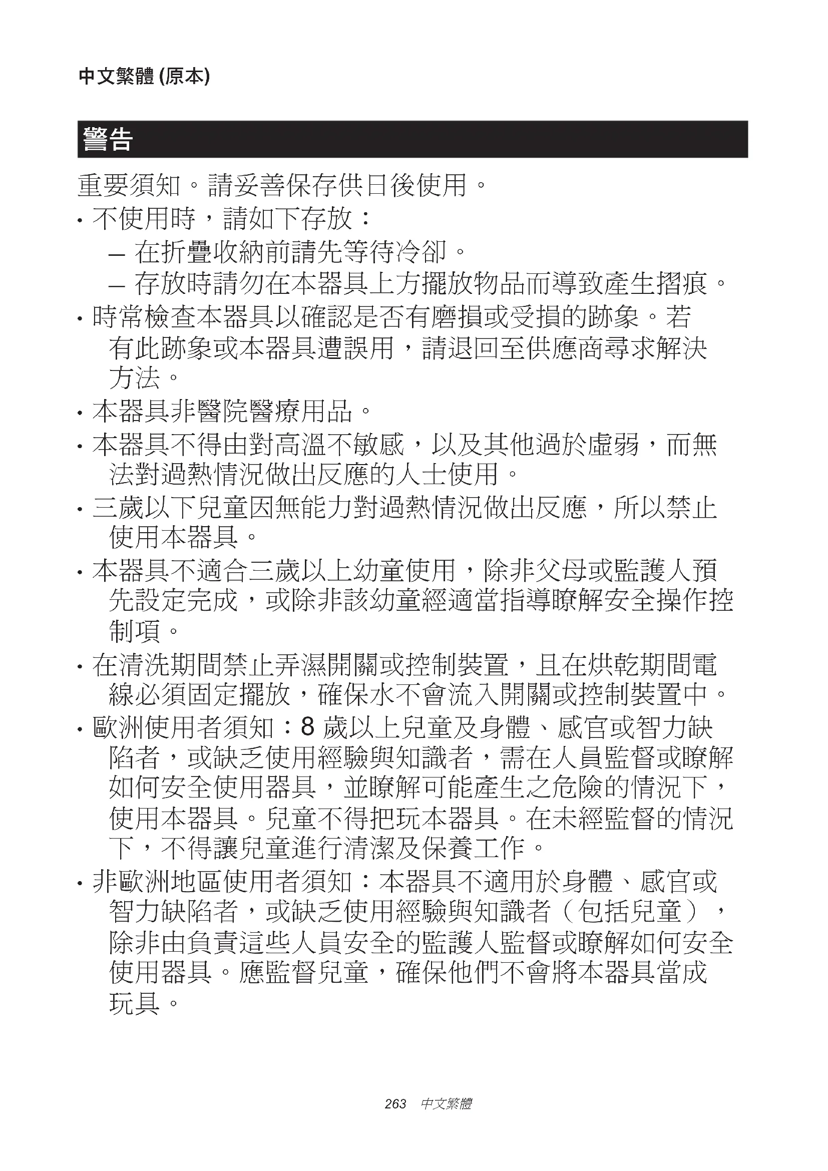 - 非歐洲地區使用者須知:本器具不適用於身體、感官或 智力缺陷者,或缺乏使用經驗與知識者(包括兒童), 除非由負責這些人員安全的監護人監督或瞭解如何安全 使用器具。應監督兒童,確保他們不會將本器具當成 玩具。264