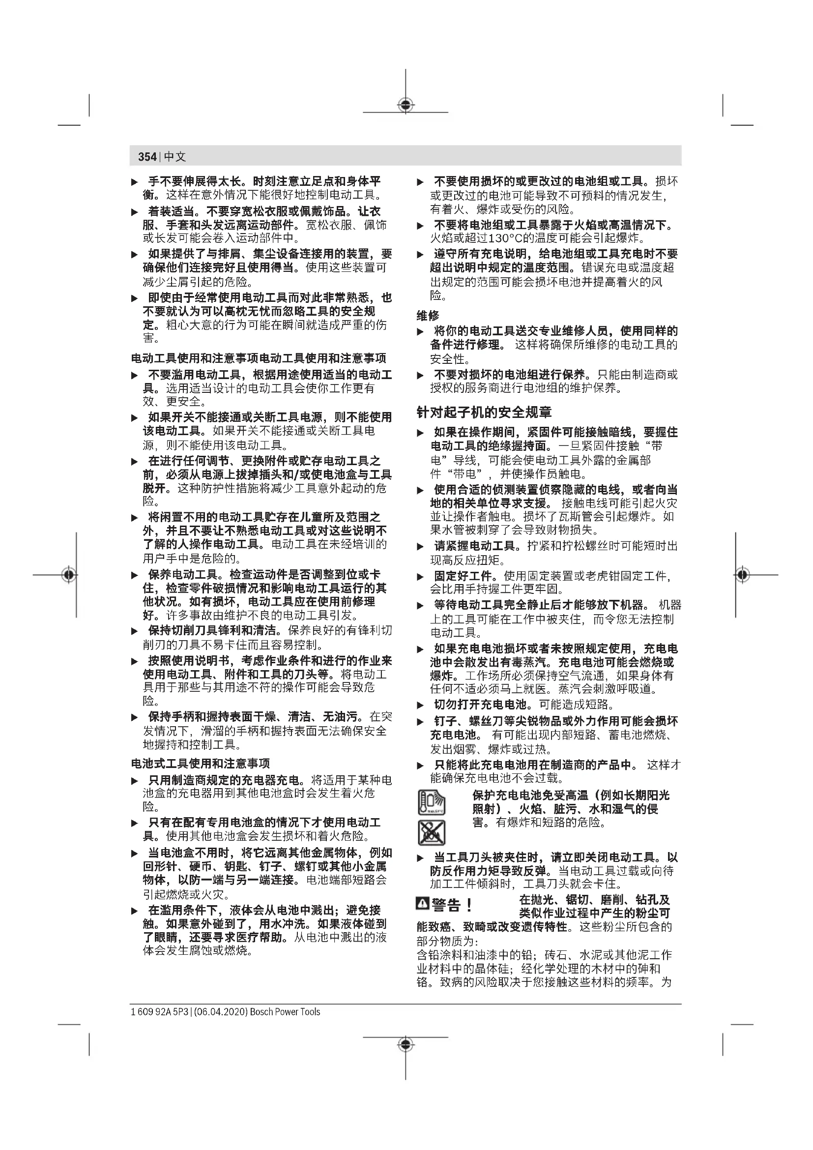 含铅涂料和油漆中的铅;砖石、水泥或其他泥工作 业材料中的晶体硅;经化学处理的木材中的砷和 铬。致病的风险取决于您接触这些材料的频率。为 1 609 92A 5P3 | (06.04.2020) Bosch Power Tools中文 | 355 了降低风险,您应当仅在通风良好的场所借助相应 的防护装备工作(例如使用专门设计用于滤除极小 粉尘微粒的呼吸防护装置)。 u 避免意外接通。安装充电电池之前,先确定电源 开关处于关闭的位置。 提携电动工具时如果把手 指按在电源开关上,或者安装充电电池时未关闭 电动工具,都可能造成工作意外。 u 仅使用完好且未磨损的工具刀头。工具刀头如果 损坏了便容易断裂,可能会伤害操作者或者造成