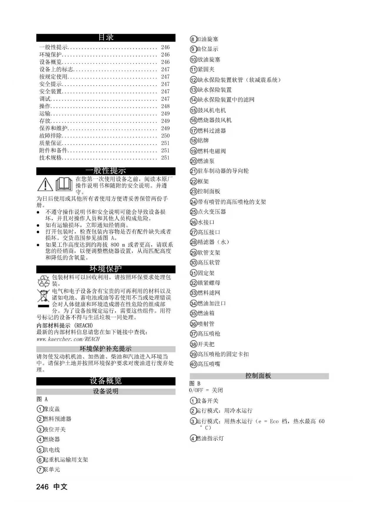 电气和电子设备含有宝贵的可再利用的材料以及 诸如电池、蓄电池或油等若使用不当或处理错误 会对人体健康和环境造成潜在性危险的组成部 分。为了设备按规定运行,需要这些组件。用符 号标记的设备不得与生活垃圾一同处理。 内部材料提示 (REACH) 最新的内部材料信息请您在如下链接中查找: www.kaercher.com/REACH