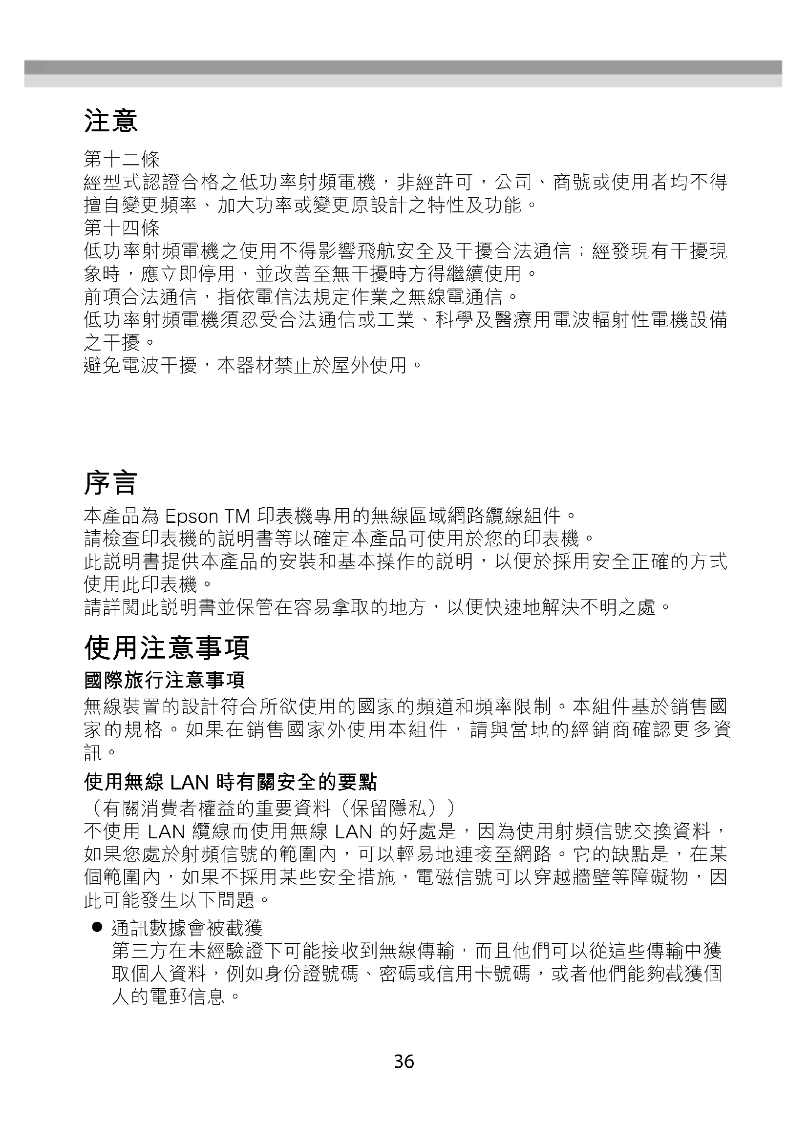 - 擷取個人數據或其他秘密資料(資料洩漏) - 假冒其他用戶發送不適當的數據(假冒) - 改動遭截取的數據內容並重新發送(偽造) - 引入會造成數據遺失或系統當機的電腦病毒(破壞) 最初,透過有關無線 LAN 產品安全的設定,和使用產品而發生這些問題 的可能性會減少,這是由於無線 LAN 卡和接入點有處理這些問題的安全 措施。我們建議您在使用本產品之前透過自己個人的判斷進行安全設定, 並且假設負有完全責任,以及完全明白如果沒有進行任何安全設定可能會