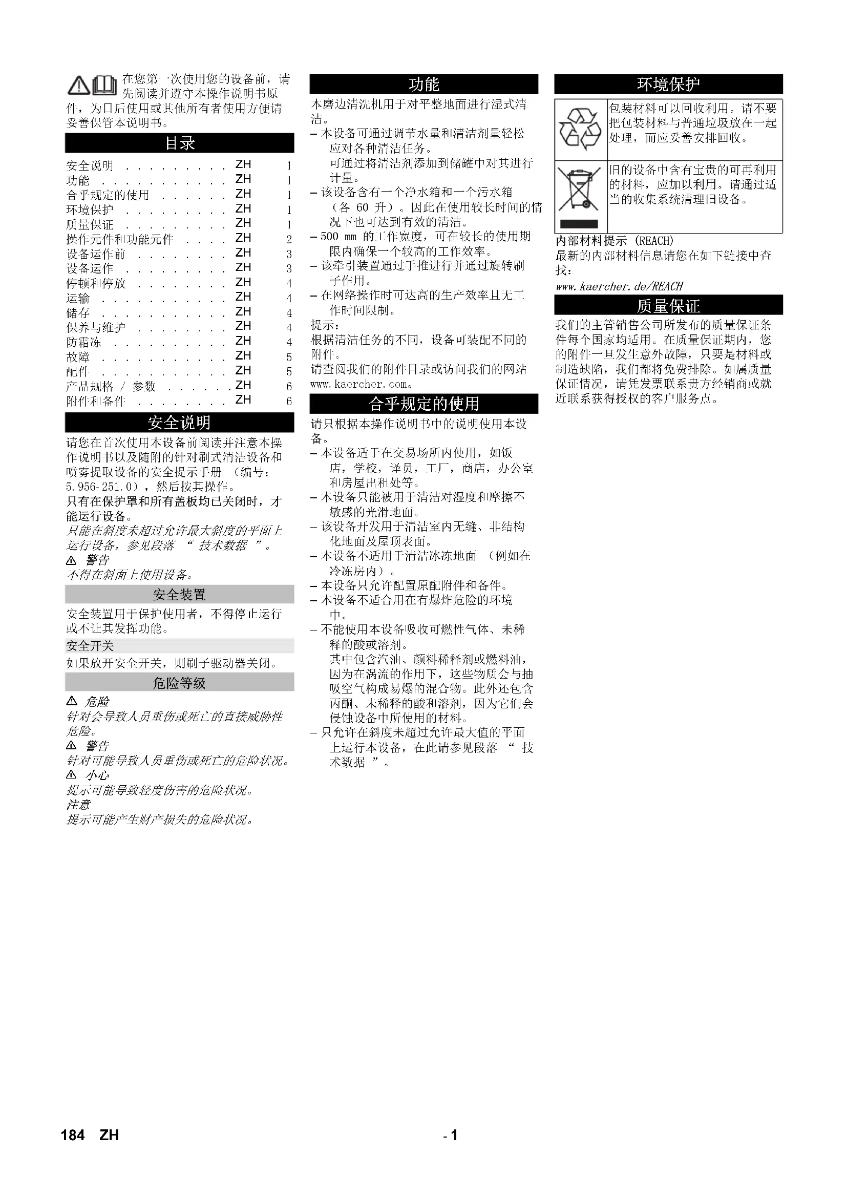 dB(A) 81 Aksesori dan suku cadang 183ID- 1 在您第一次使用您的设备前,请先阅读并遵守本操作说明书原件,为日后使用或其他所有者使用方便请妥善保管本说明书。请您在首次使用本设备前阅读并注意本操作说明书以及随附的针对刷式清洁设备和喷雾提取设备的安全提示手册 (编号:5.956 251.0),然后按其操作。只有在保护罩和所有盖板均已关闭时,才能运行设备。 只能在斜度未超过允许最大斜度的平面上 运行设备,参见段落 “ 技术数据 ”。