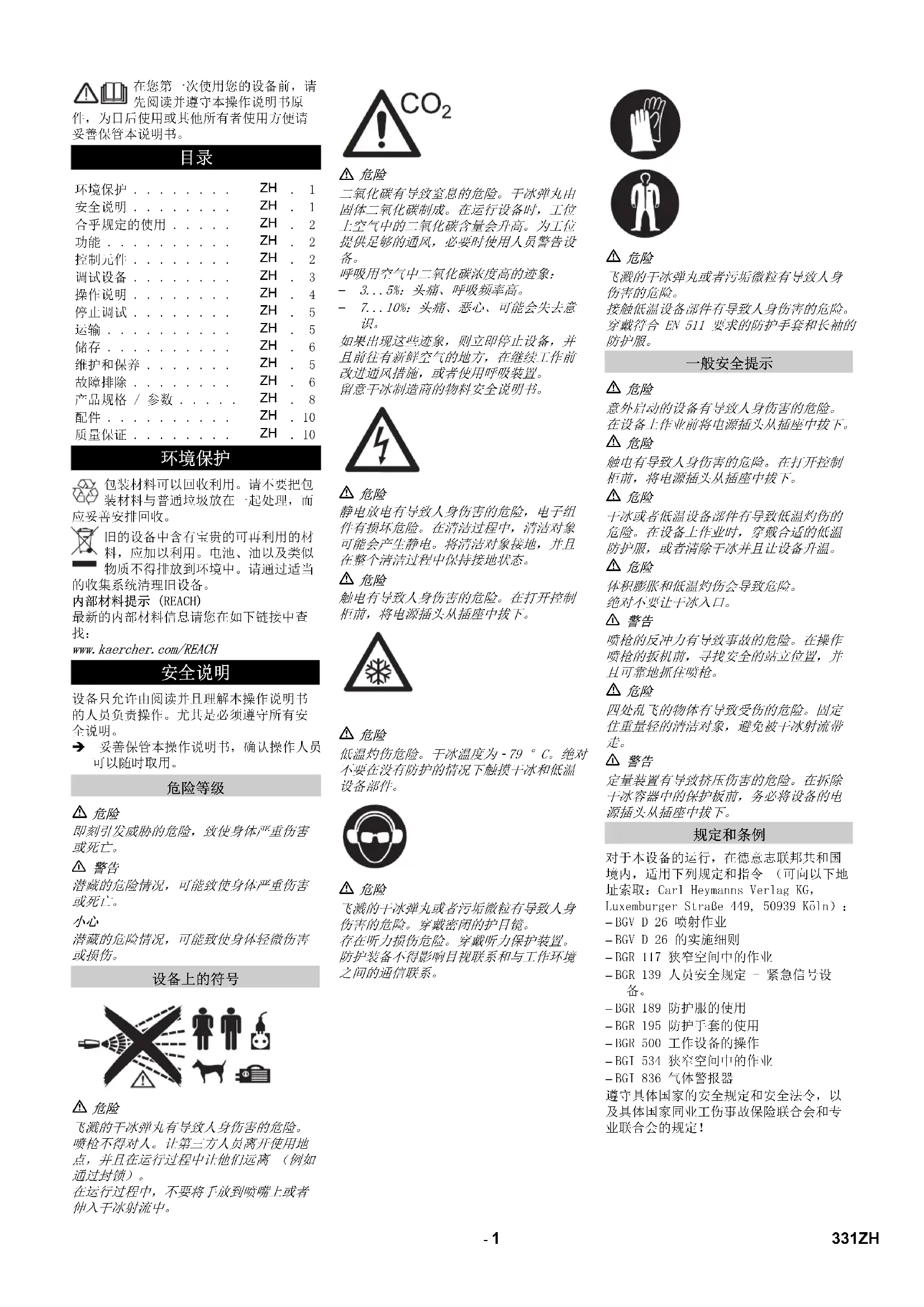二氧化碳有导致窒息的危险。干冰弹丸由 固体二氧化碳制成。在运行设备时,工位 上空气中的二氧化碳含量会升高。为工位 提供足够的通风,必要时使用人员警告设