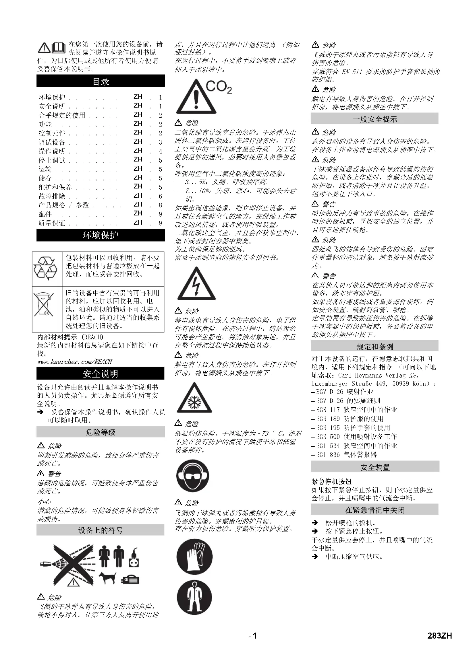 对于本设备的运行,在德意志联邦共和国境内,适用下列规定和指令 (可向以下地址索取:Carl Heymanns Verlag KG,Luxemburger Straße 449, 50939 Köln):– BGV D 26 喷射作业– BGV D 26 的实施细则– BGR 117 狭窄空间中的作业– BGR 189 防护服的使用– BGR 195 防护手套的使用– BGR 500 使用喷射设备工作– BGI 534 狭窄空间中的作业– BGI 836 气体警报器如果按下紧急停止按钮,则干冰定量供应会停止,并且喷嘴中的气流会中断。 松开喷枪的扳机。 按下紧急停止按钮。干冰定量供应会停止,并且喷嘴中的气流