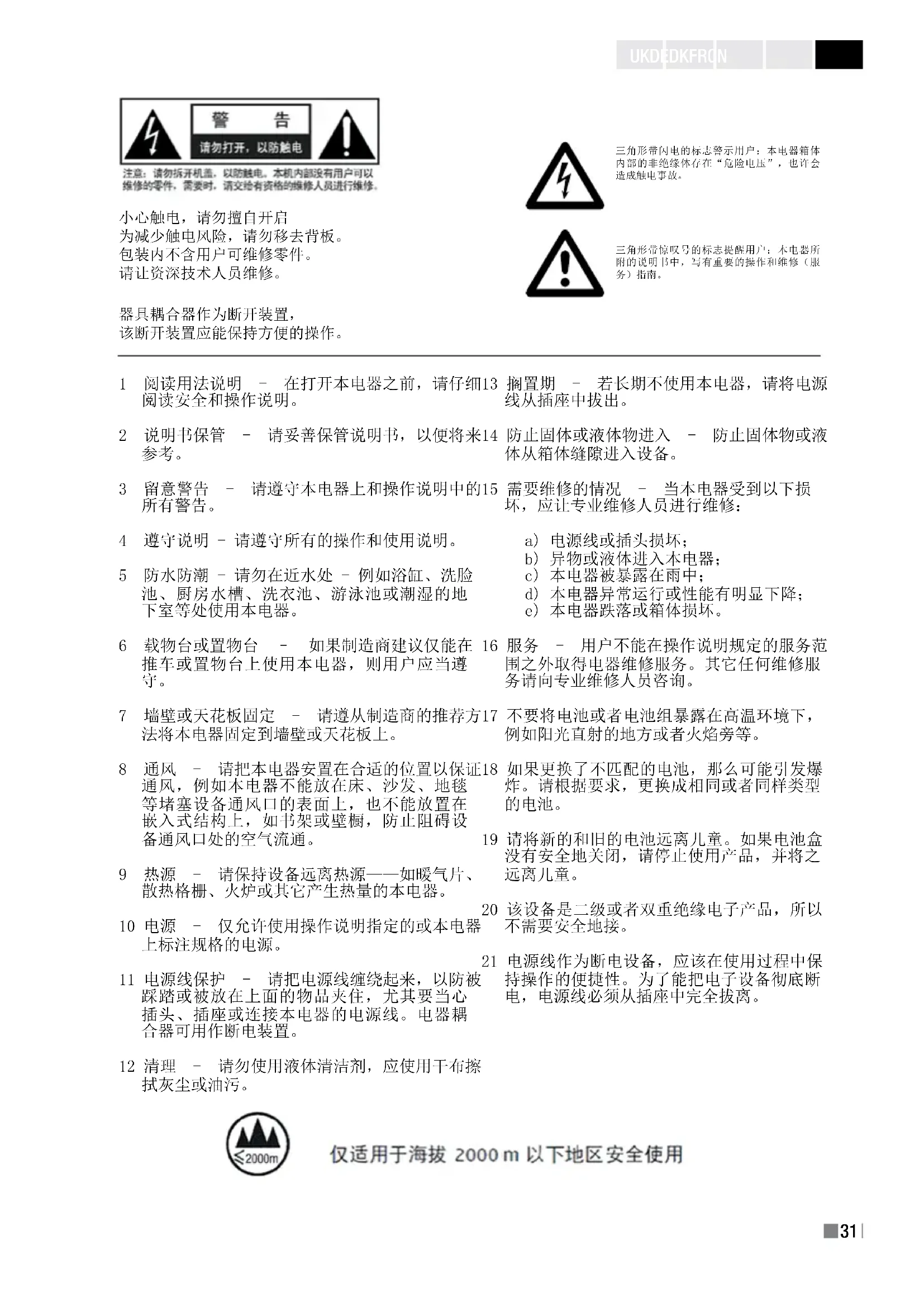 14 防止固体或液体物进入 - 防止固体物或液 体从箱体缝隙进入设备。 15 需要维修的情况 - 当本电器受到以下损 坏,应让专业维修人员进行维修: a) 电源线或插头损坏; b) 异物或液体进入本电器; c) 本电器被暴露在雨中; d) 本电器异常运行或性能有明显下降; e) 本电器跌落或箱体损坏。 16 服务 - 用户不能在操作说明规定的服务范 围之外取得电器维修服务。其它任何维修服 务请向专业维修人员咨询。 17 不要将电池或者电池组暴露在高温环境下, 例如阳光直射的地方或者火焰旁等。 18 如果更换了不匹配的电池,那么可能引发爆 炸。请根据要求,更换成相同或者同样类型
