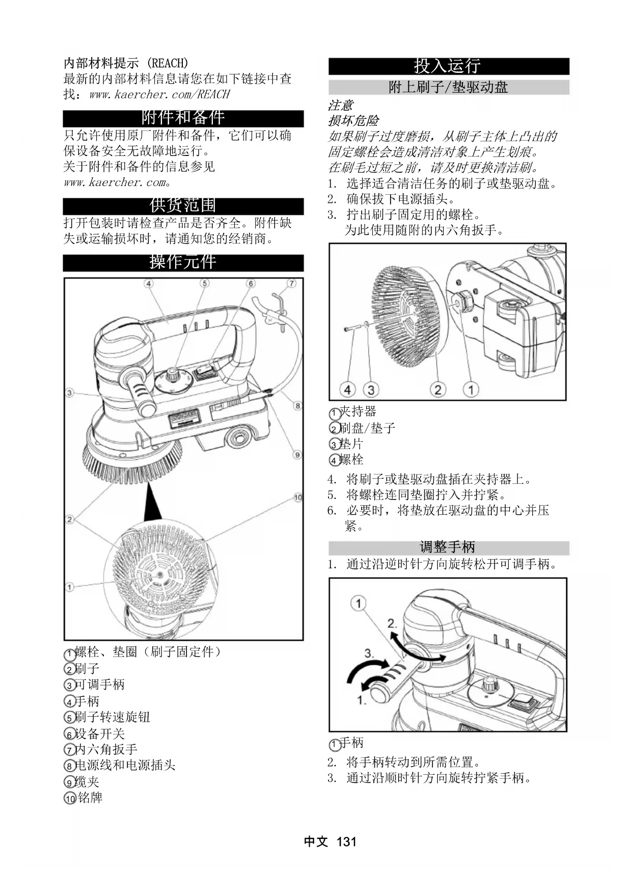 1 螺栓、垫圈(刷子固定件) 2 刷子 3 可调手柄 4 手柄 5 刷子转速旋钮 6 设备开关 7 内六角扳手 8 电源线和电源插头 9 缆夹 10 铭牌