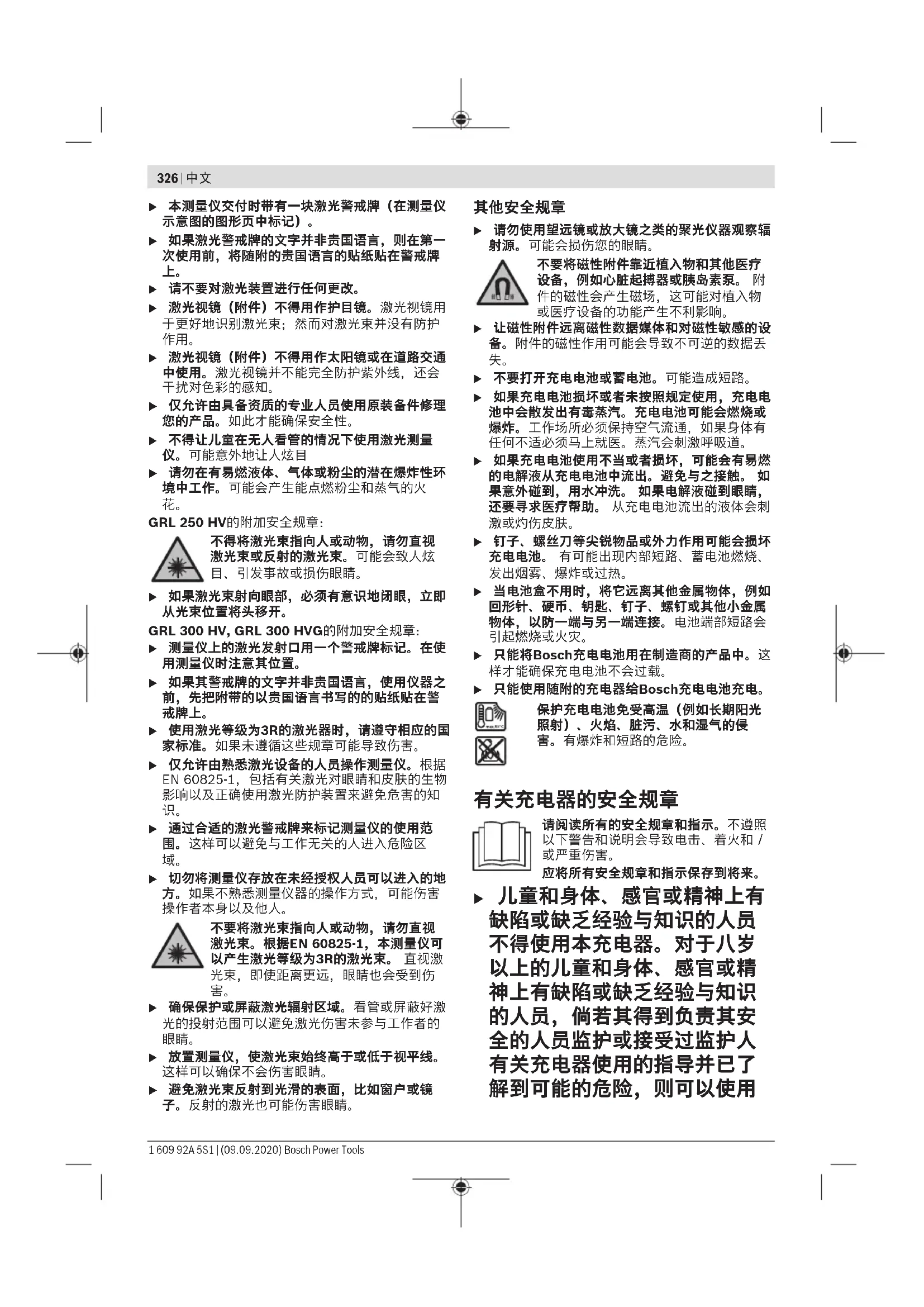 应将所有安全规章和指示保存到将来。 u 儿童和身体、感官或精神上有 缺陷或缺乏经验与知识的人员 不得使用本充电器。对于八岁 以上的儿童和身体、感官或精 神上有缺陷或缺乏经验与知识 的人员,倘若其得到负责其安 全的人员监护或接受过监护人 有关充电器使用的指导并已了 解到可能的危险,则可以使用 1 609 92A 5S1 | (09.09.2020) Bosch Power Tools中文 | 327 本充电器。否则会有误操作和