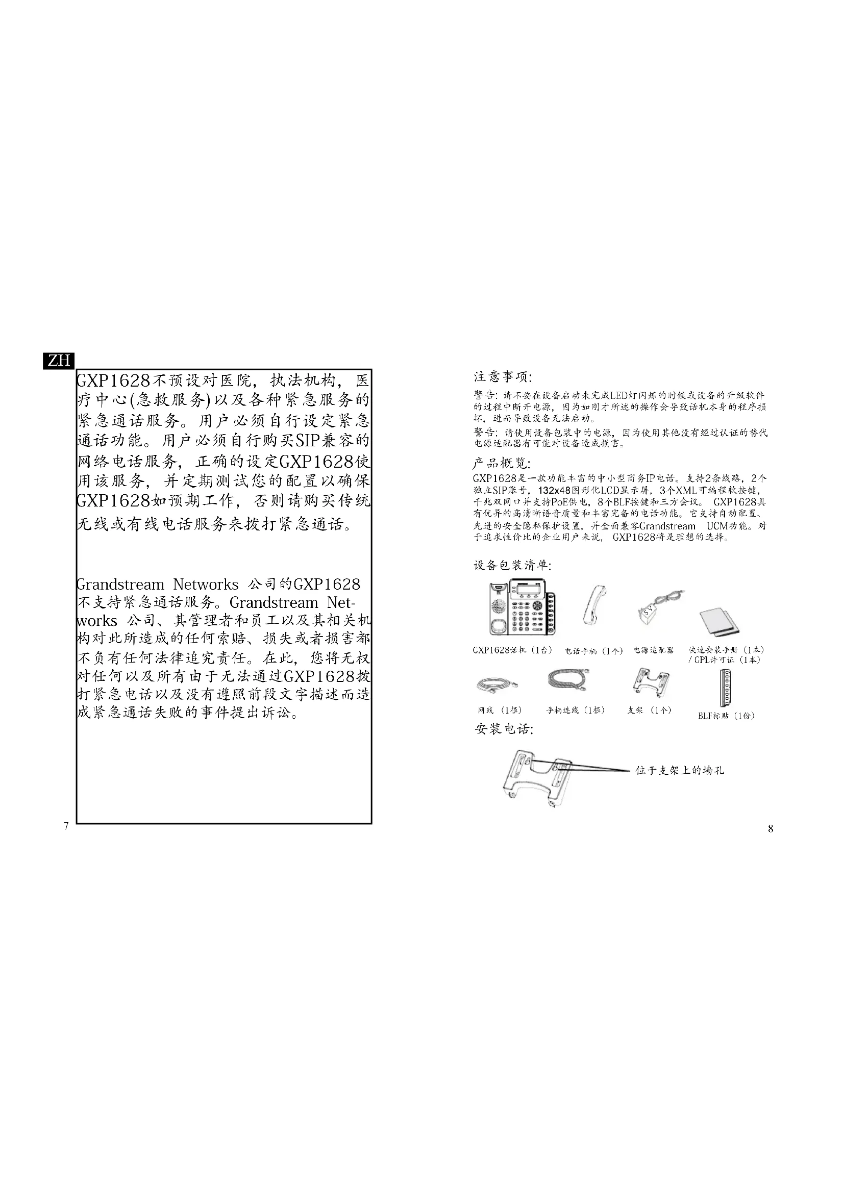 Grandstream Networks 公司的GXP1628 不支持紧急通话服务。Grandstream Net- works 公司、其管理者和员工以及其相关机 构对此所造成的任何索赔、损失或者损害都 不负有任何法律追究责任。在此,您将无权 对任何以及所有由于无法通过GXP1628拨 打紧急电话以及没有遵照前段文字描述而造 成紧急通话失败的事件提出诉讼。