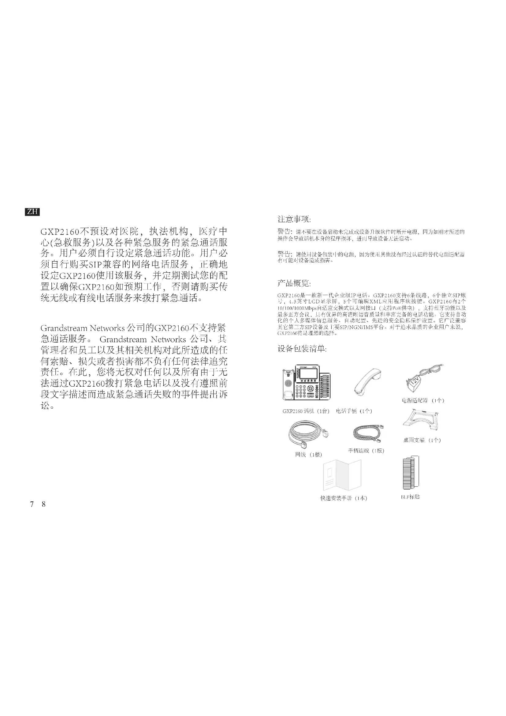 further congure the phone using either a static IP or DHCP.7 8 GXP2160不预设对医院,执法机构,医疗中 心(急救服务)以及各种紧急服务的紧急通话服 务。用户必须自行设定紧急通话功能。用户必 须自行购买SIP兼容的网络电话服务,正确地 设定GXP2160使用该服务,并定期测试您的配 置以确保GXP2160如预期工作,否则请购买传 统无线或有线电话服务来拨打紧急通话。 Grandstream Networks 公司的GXP2160不支持紧 急通话服务。 Grandstream Networks 公司、其 管理者和员工以及其相关机构对此所造成的任 何索赔、损失或者损害都不负有任何法律追究 责任。在此,您将无权对任何以及所有由于无 法通过GXP2160拨打紧急电话以及没有遵照前 段文字描述而造成紧急通话失败的事件提出诉