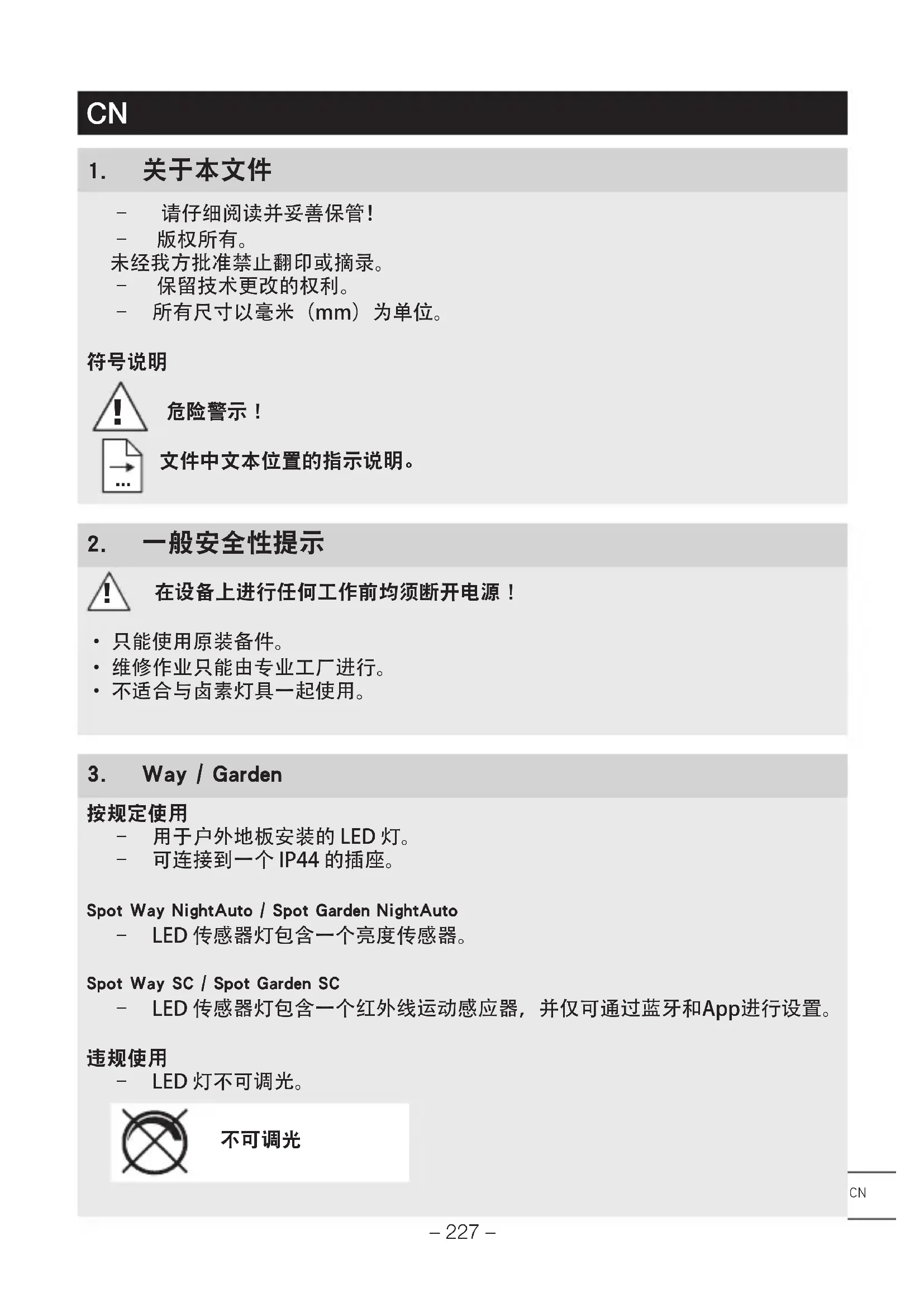 – 用于户外地板安装的LED灯。 – 可连接到一个IP44的插座。 SpotWayNightAuto/SpotGardenNightAuto – LED传感器灯包含一个亮度传感器。 SpotWaySC/SpotGardenSC – LED传感器灯包含一个红外线运动感应器,并仅可通过蓝牙和App进行设置。
