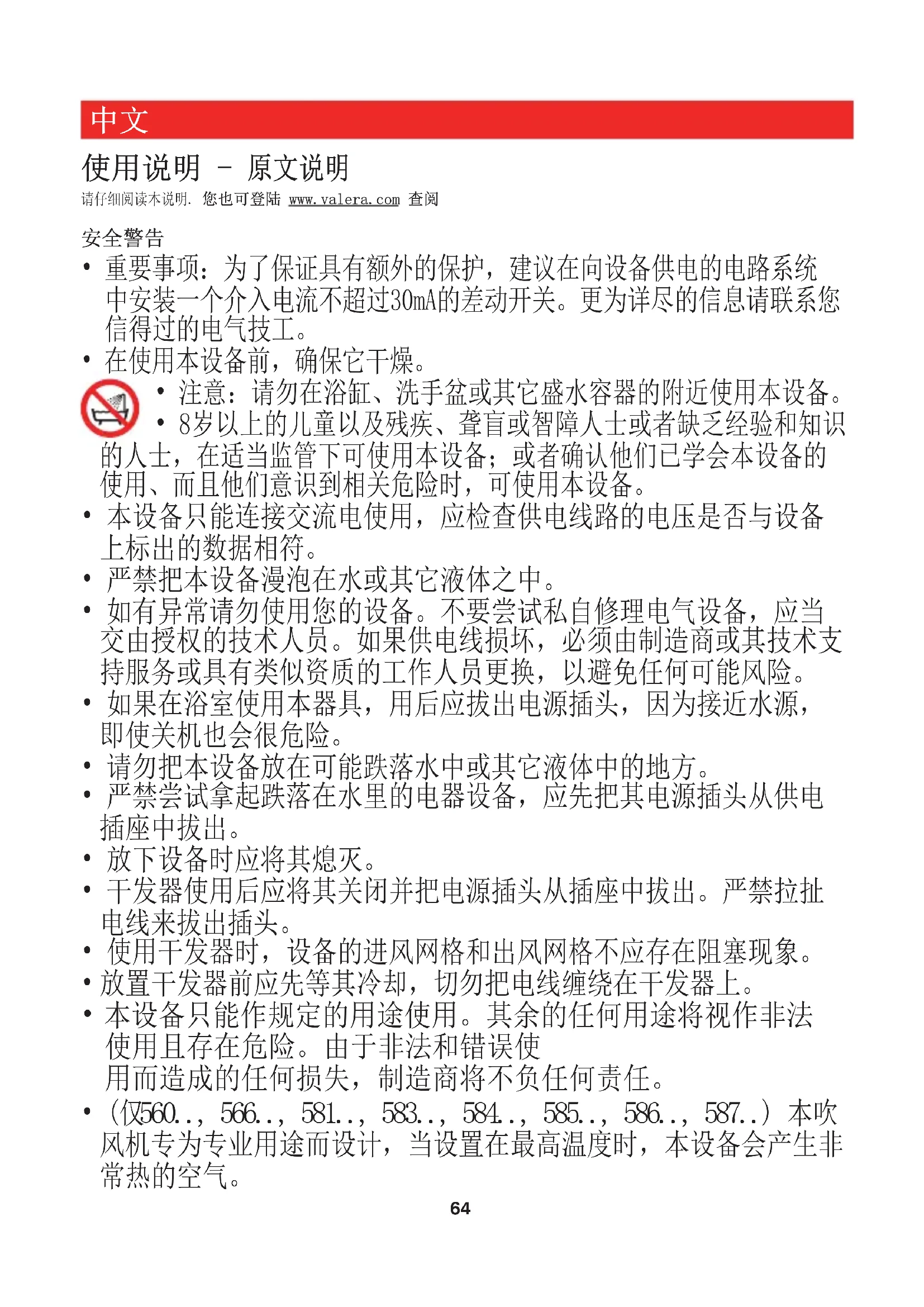 - 注意:请勿在浴缸、洗手盆或其它盛水容器的附近使用本设备。