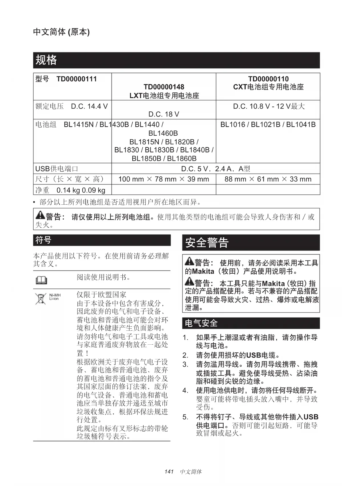 警告: 使用前,请务必阅读采用本工具 的Makita(牧田)产品使用说明书。 警告: 本工具只能与Makita( 牧 田 )指 定的产品搭配使用。若与不兼容的产品搭配 使用可能会导致火灾、过热、爆炸或电解液