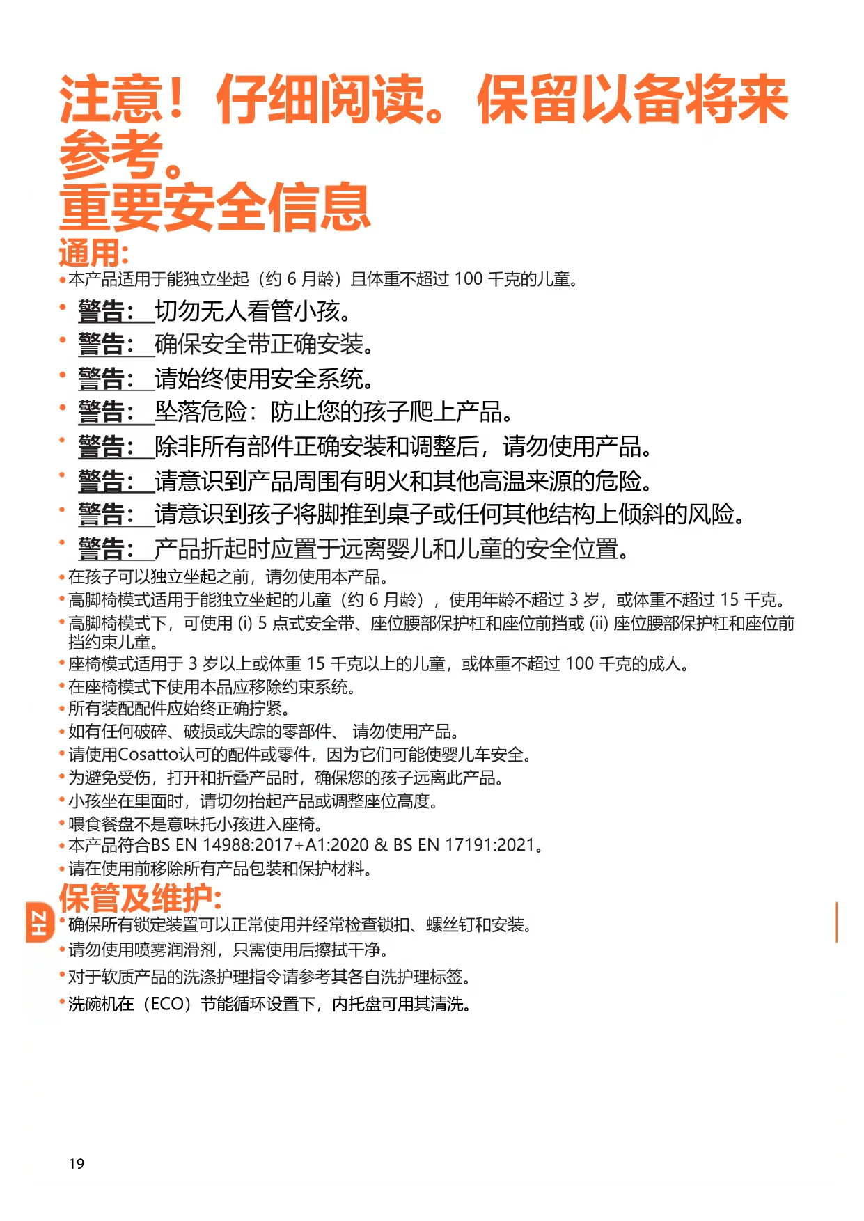 在孩子可以独立坐起之前,请勿使用本产品。 高脚椅模式适用于能独立坐起的儿童(约 6 月龄),使用年龄不超过 3 岁,或体重不超过 15 千克。 高脚椅模式下,可使用 (i) 5 点式安全带、座位腰部保护杠和座位前挡或 (ii) 座位腰部保护杠和座位前挡约束儿童。 座椅模式适用于 3 岁以上或体重 15 千克以上的儿童,或体重不超过 100 千克的成人。 在座椅模式下使用本品应移除约束系统。 所有装配配件应始终正确拧紧。 如有任何破碎、破损或失踪的零部件、 请勿使用产品。 请使用Cosatto认可的配件或零件,因为它们可能使婴儿车安全。 为避免受伤,打开和折叠产品时,确保您的孩子远离此产品。 小孩坐在里面时,请切勿抬起产品或调整座位高度。 喂食餐盘不是意味托小孩进入座椅。 本产品符合BS EN 14988:2017+A1:2020 & BS EN 17191:2021。 请在使用前移除所有产品包装和保护材料。