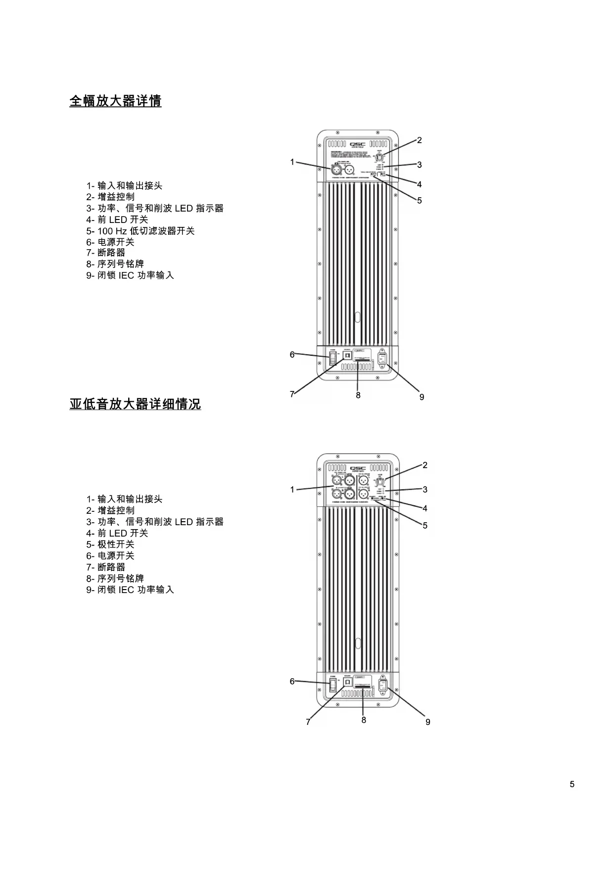 重要事项!如果使用其它制造商的全幅扬声 器,我们建议将其连接到 QSC 亚低音扬声器 的 100 赫兹低切输出。这会确保相对亚低音扬 声器的全幅扬声器的正确定相。 全幅扬声器输入 (IN)和输出 (OUT)接头 亚低音扬声器输入 (IN)和输出 (OUT)接头11