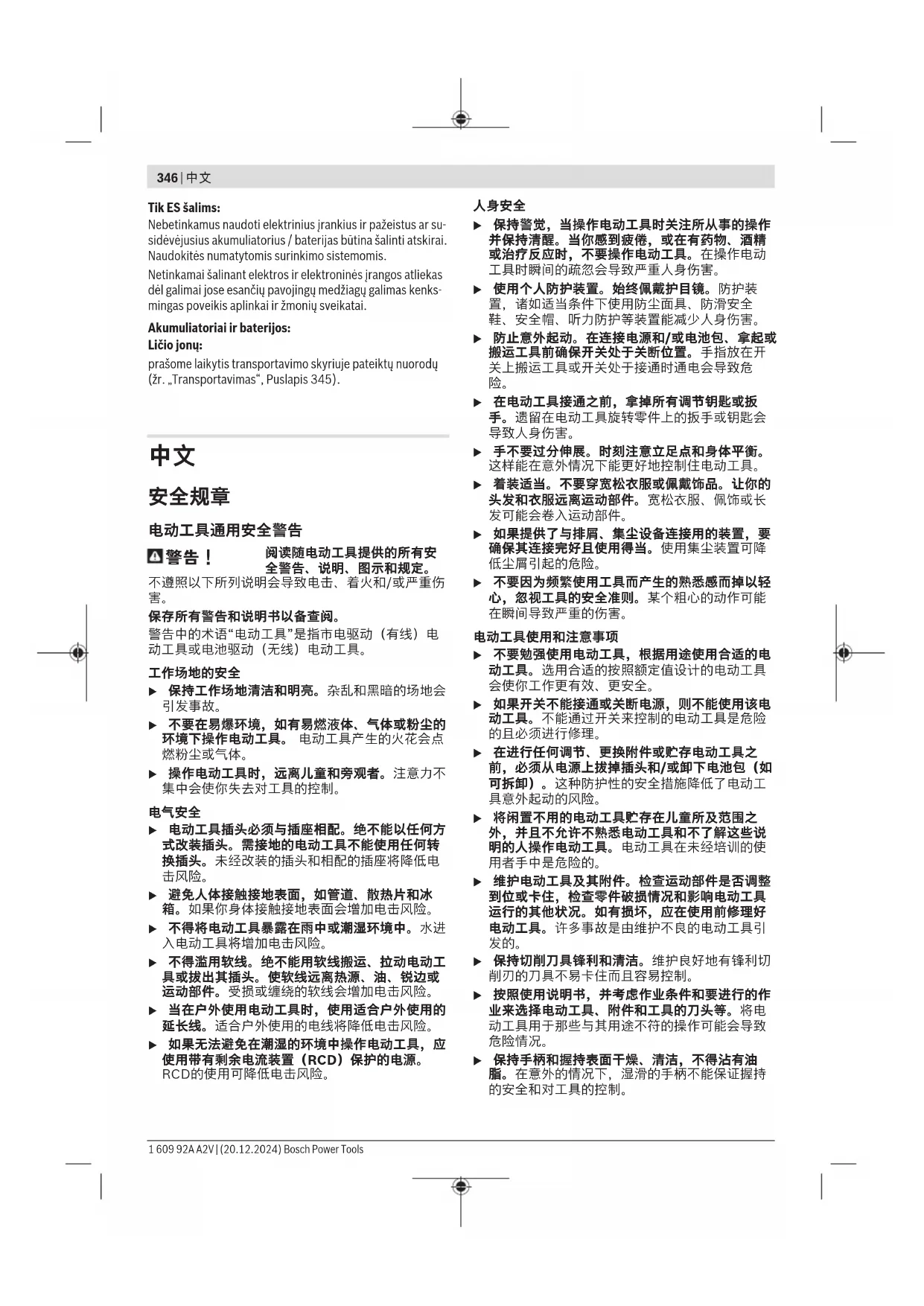 u 保持手柄和握持表面干燥、清洁,不得沾有油 脂。在意外的情况下,湿滑的手柄不能保证握持 的安全和对工具的控制。 1 609 92A A2V | (20.12.2024) Bosch Power Tools中文 | 347 电池式工具使用和注意事项 u 仅使用生产者规定的充电器充电。将适用于某种 电池包的充电器用到其他电池包时可能会发生着