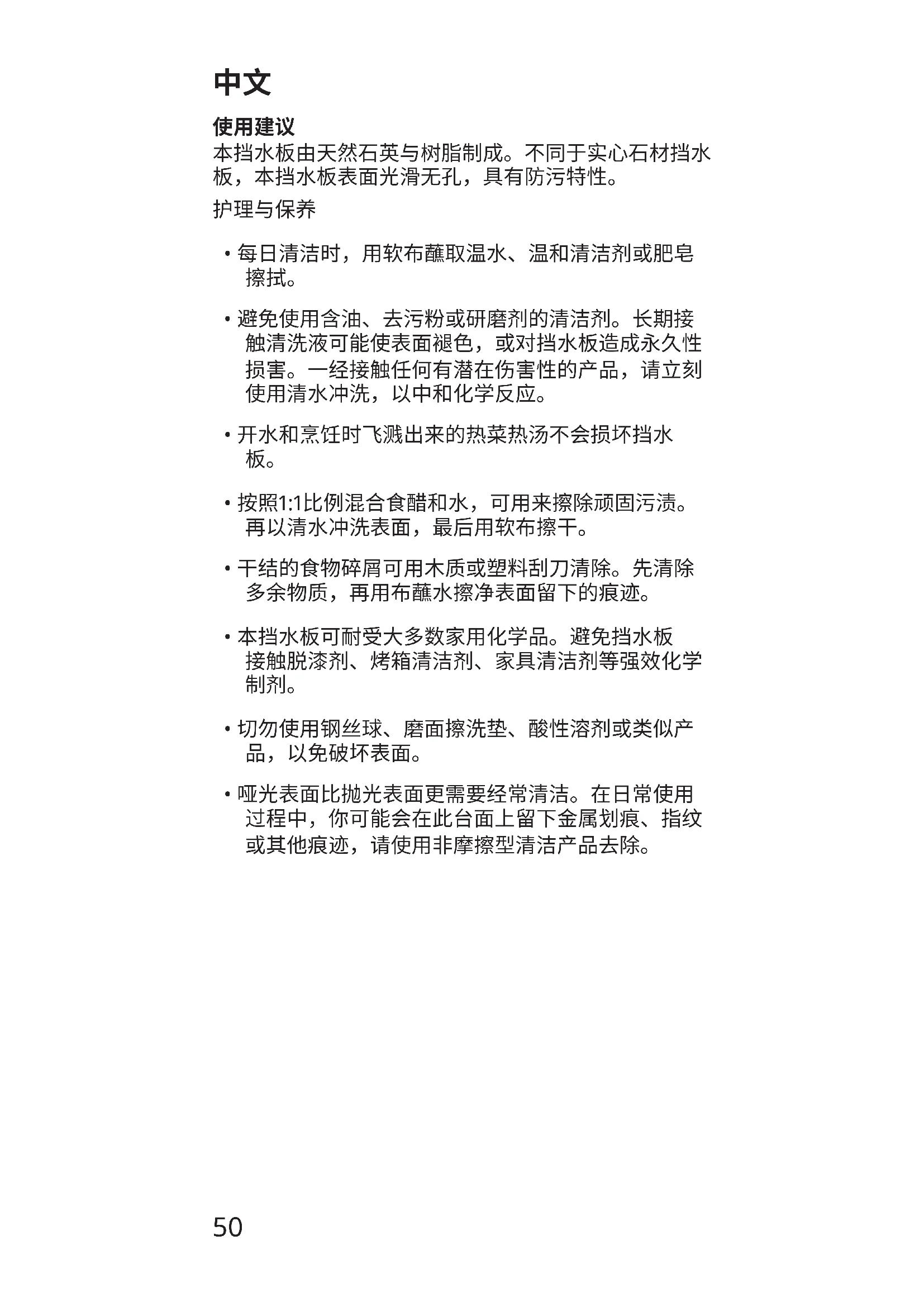 - 哑光表面比抛光表面更需要经常清洁。在日常使用 过程中,你可能会在此台面上留下金属划痕、指纹 或其他痕迹,请使用非摩擦型清洁产品去除。51