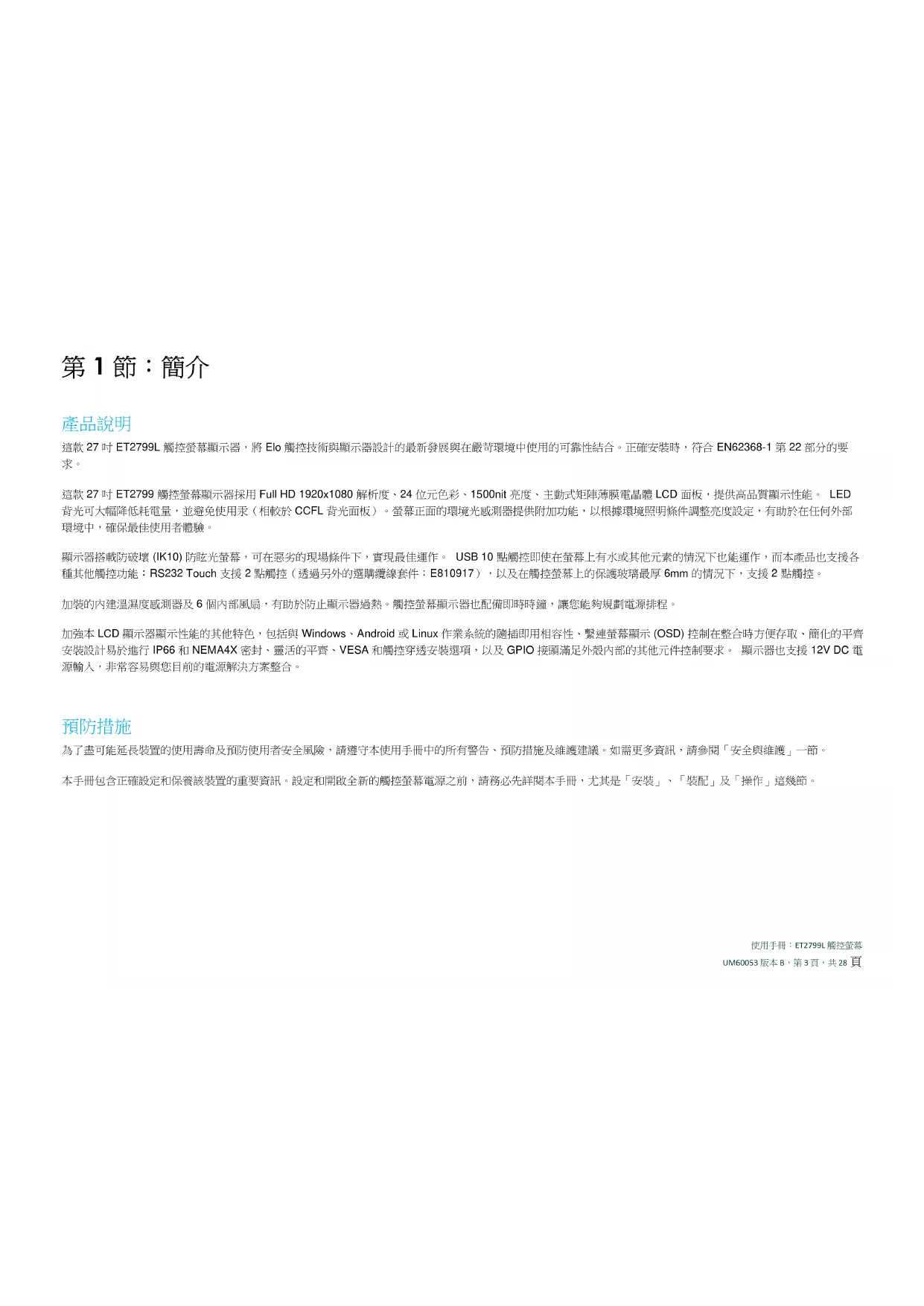 為了盡可能延長裝置的使用壽命及預防使用者安全風險,請遵守本使用手冊中的所有警告、預防措施及維護建議。如需更多資訊,請參閱「安全與維護」一節。 本手冊包含正確設定和保養該裝置的重要資訊。設定和開啟全新的觸控螢幕電源之前,請務必先詳閱本手冊,尤其是「安裝」、「裝配」及「操作」這幾節。使用手冊:ET2799L 觸控螢幕 UM60053 版本 B,第 4 頁,共 28 頁