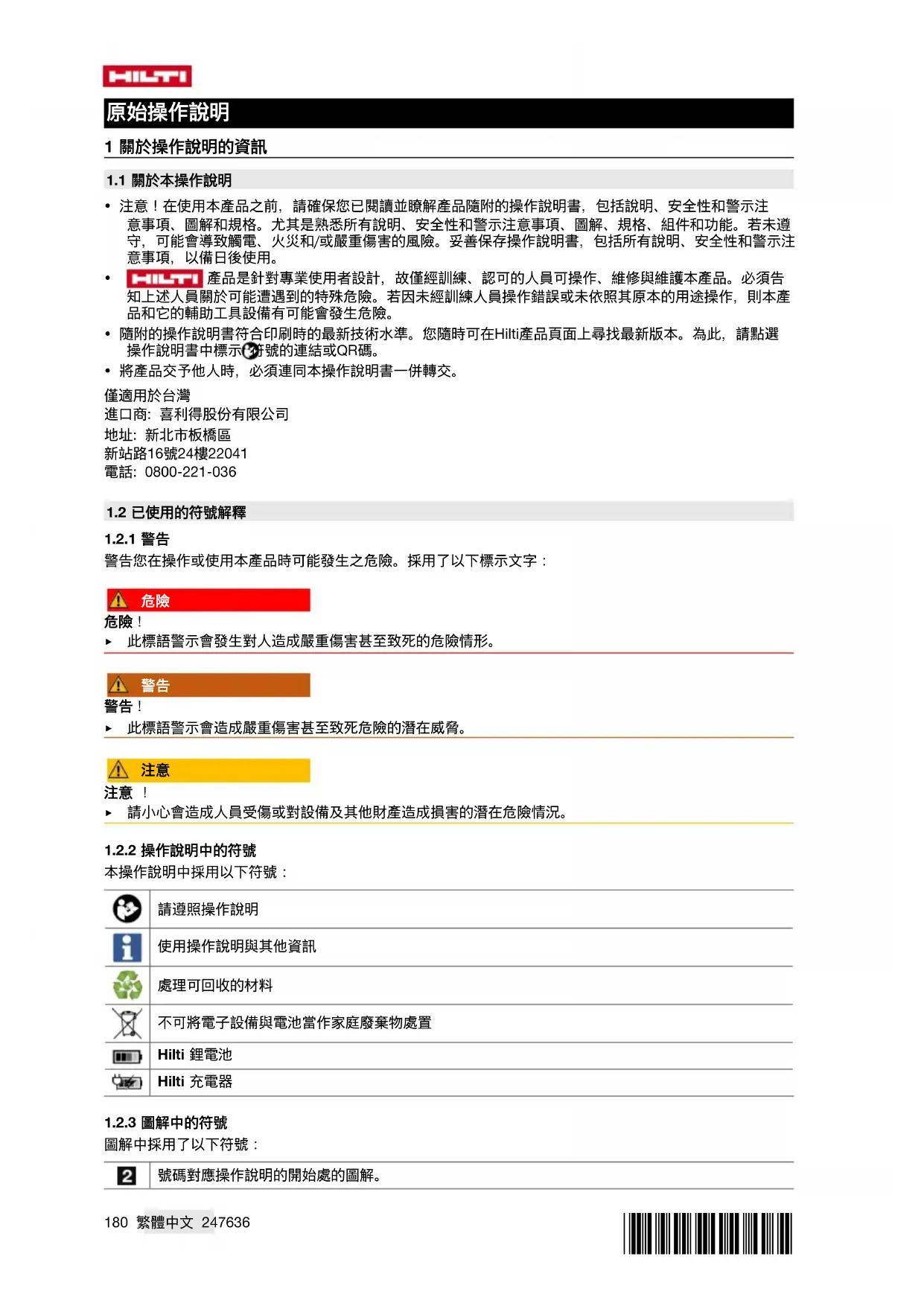 9 廢棄設備處置 請勿將本產品當一般家用廢棄物處理! Hilti機具、設備或裝置所採用的材料大部分均可回收再利用。進行回收前,必須先將材料正確分類。在許多國 家中,您可以將舊機具及設備送回Hilti進行回收。若需更多資訊,請向Hilti維修中心或Hilti銷售代表諮詢。 10 製造商保固 ▶ 如果您對於保固條件有任何問題,請聯絡當地Hilti代理商。 Hilti Taiwan Co., Ltd. 24F., No. 16, Xinzhan Rd., Banqiao Dist., New Taipei City 220, Taiwan (R.O.C.) Tel. 0800221036 11 其他資訊 有關於操作、技術、環境和回收的更多資訊,請參訪以下連結:qr.hilti.com/manual/?id=247636*247636* 247636 中文 185 您也可在文件最後找到本連結的QR碼。 12 製造商資訊